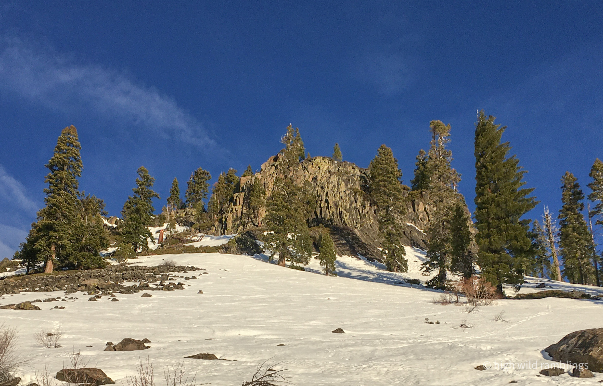 Columnar basalt swooping up out of the snow. I first found this formation moonlight fresh pow, roomer skiing on my old wooden three pins. It made a big impression. Not sure just how the usually strait parallel sided columns were deformed, probably slow distortion while they were buried, cooling and contracting, splitting along geometric crystalline lines with flair. (I have better photos of it somewhere which I’ll post and link when they turn up)