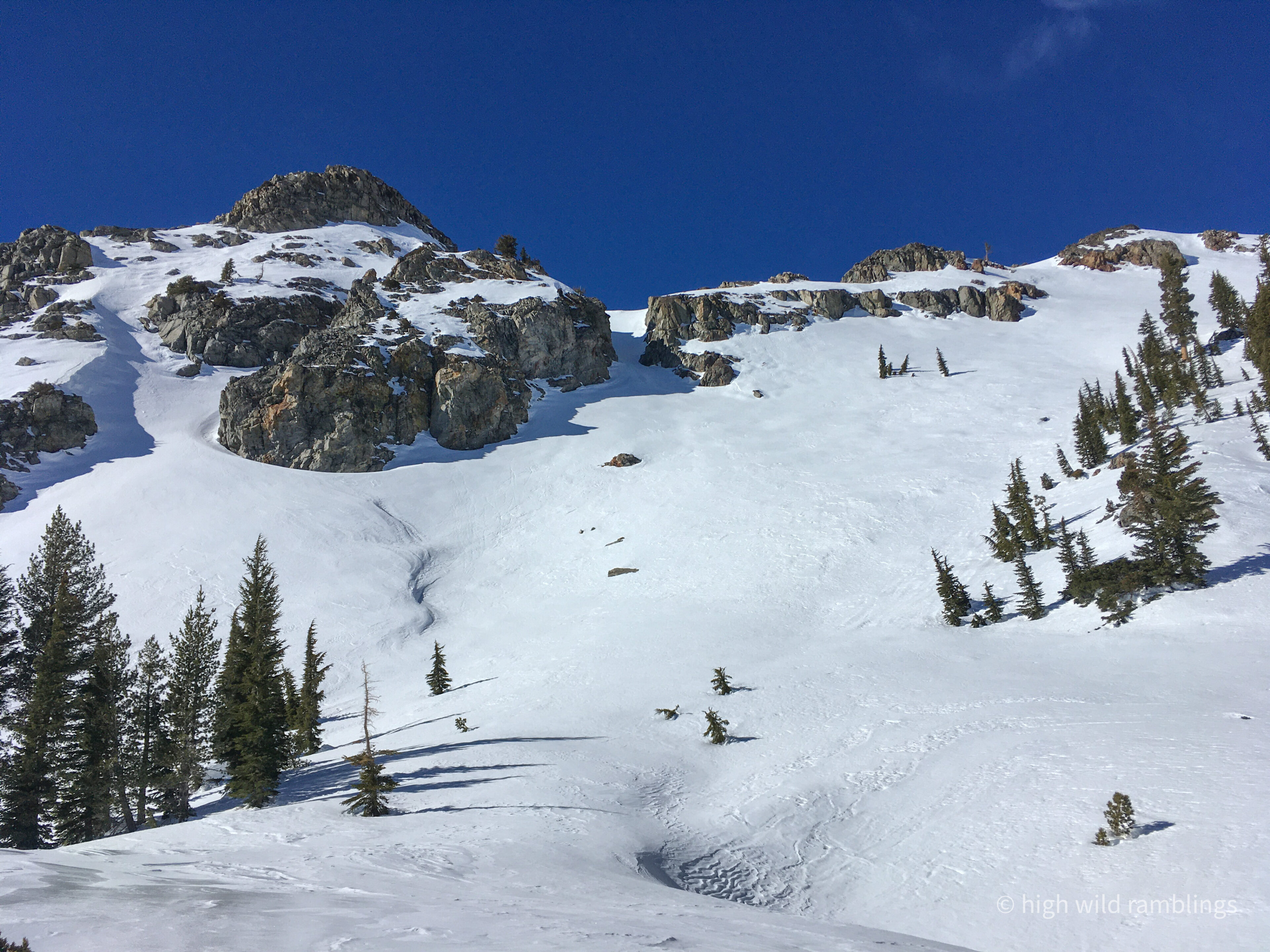 These chutes call out, but the exposure is off, and the snow is not ripe, its punchy and crusty, and better saved for another day. If we leave ruts in it now, it wont be smooth when the snow ripens. It’s the classic marshmallow queery, one now or two later? such simple math should be necessary for graduating kindergarten (consumerism’s scarcity fallacy notwithstanding). Dont shake the tree when the fruit’s not ripe.