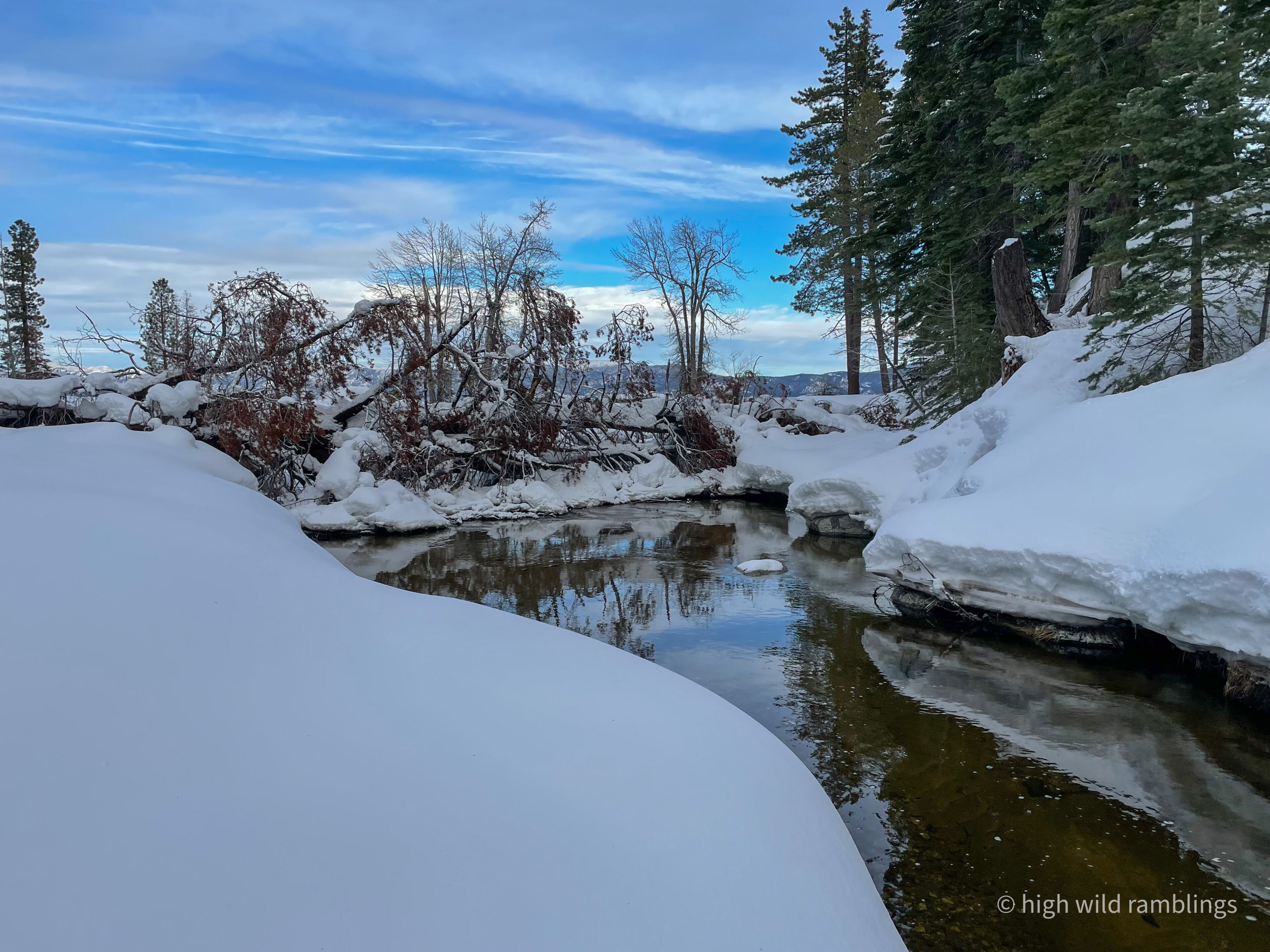 A four foot diameter Lodgepole toppled on the shore, damming the mouth of the creek. This tree has historic barbed wire growing a foot deep in the trunk, maybe from the original pioneer here in the 1860’s. Whats a hundred and fifty years to a tree that old?