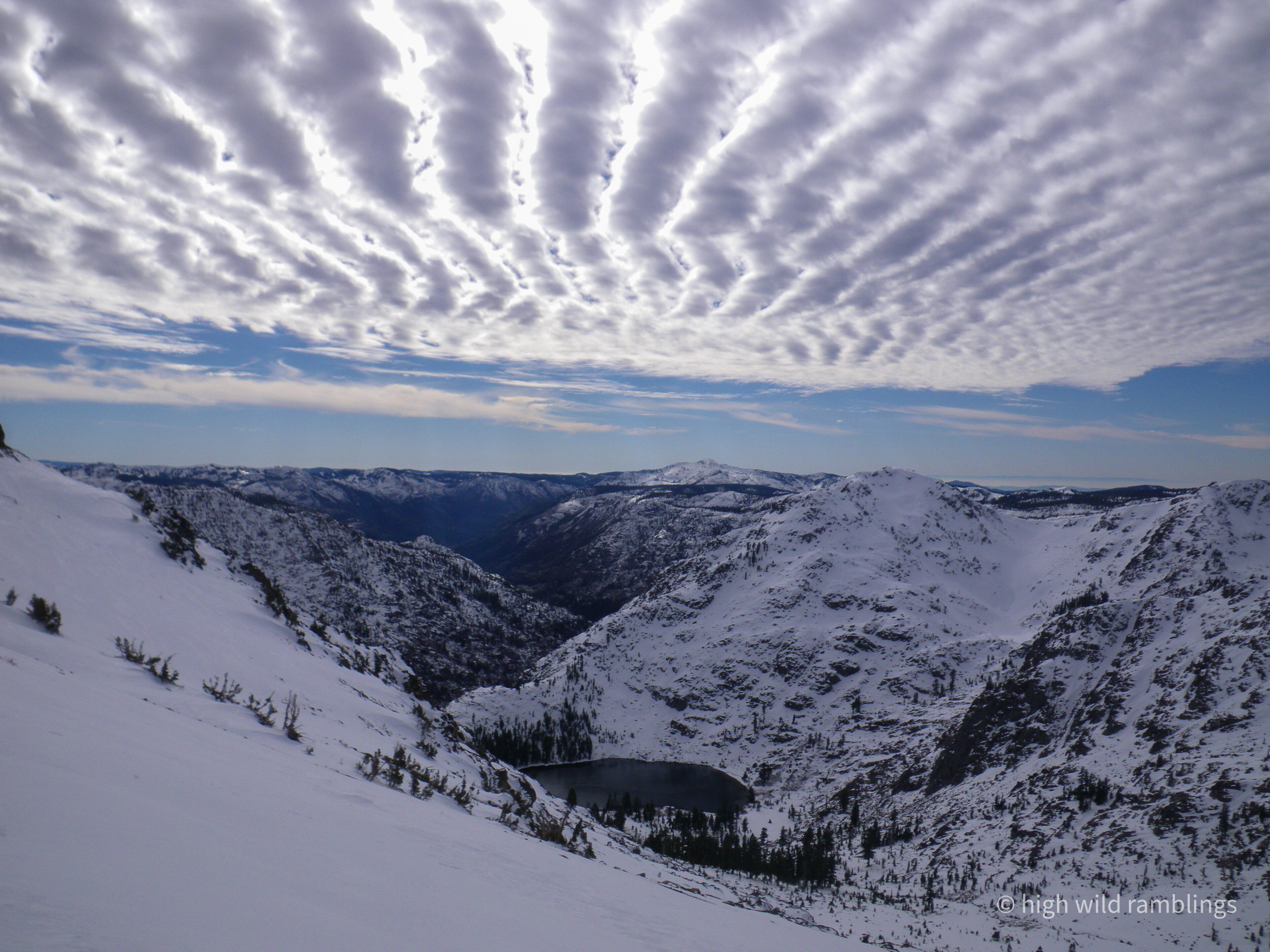 The washboard sky echoes the bends of the canyon, waves over waves. In many places in this part of the west slope of the Sierra, successive mountain tops and ridge tops are at the same level, as seen here, because that is the plane of the former terrain before the Sierra was uplifted and incut, when this region was old, worn down, low rolling metamorphic hills.