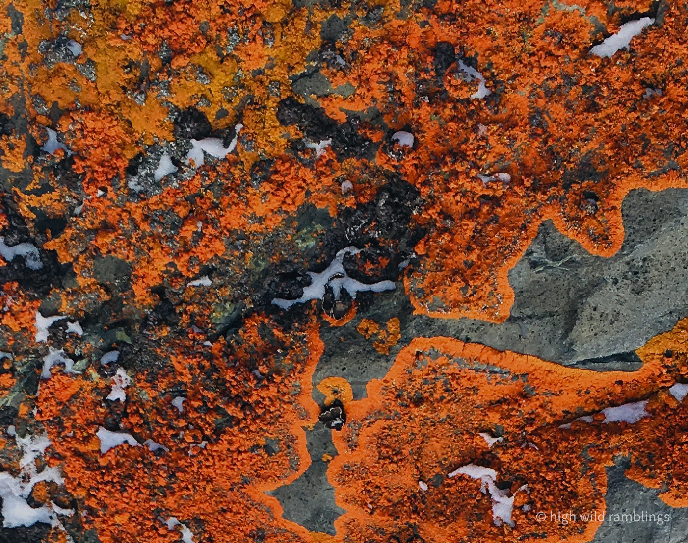 Possible Elegant Sunburst Lichen, Rusavskia elegans, which has been used to date rock faces, said to grow a half millimeter per year, and favoring such exposed habitat that it has been successfully used to study resistance to the extremes of outer space exposure. (photo by CC)