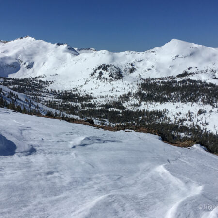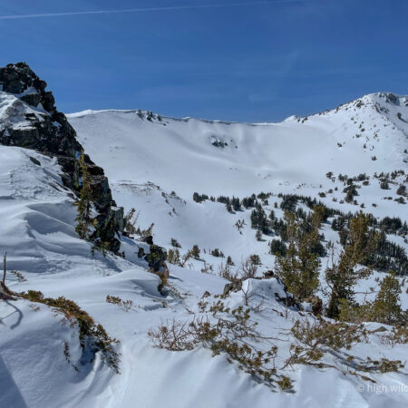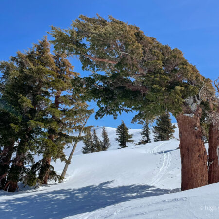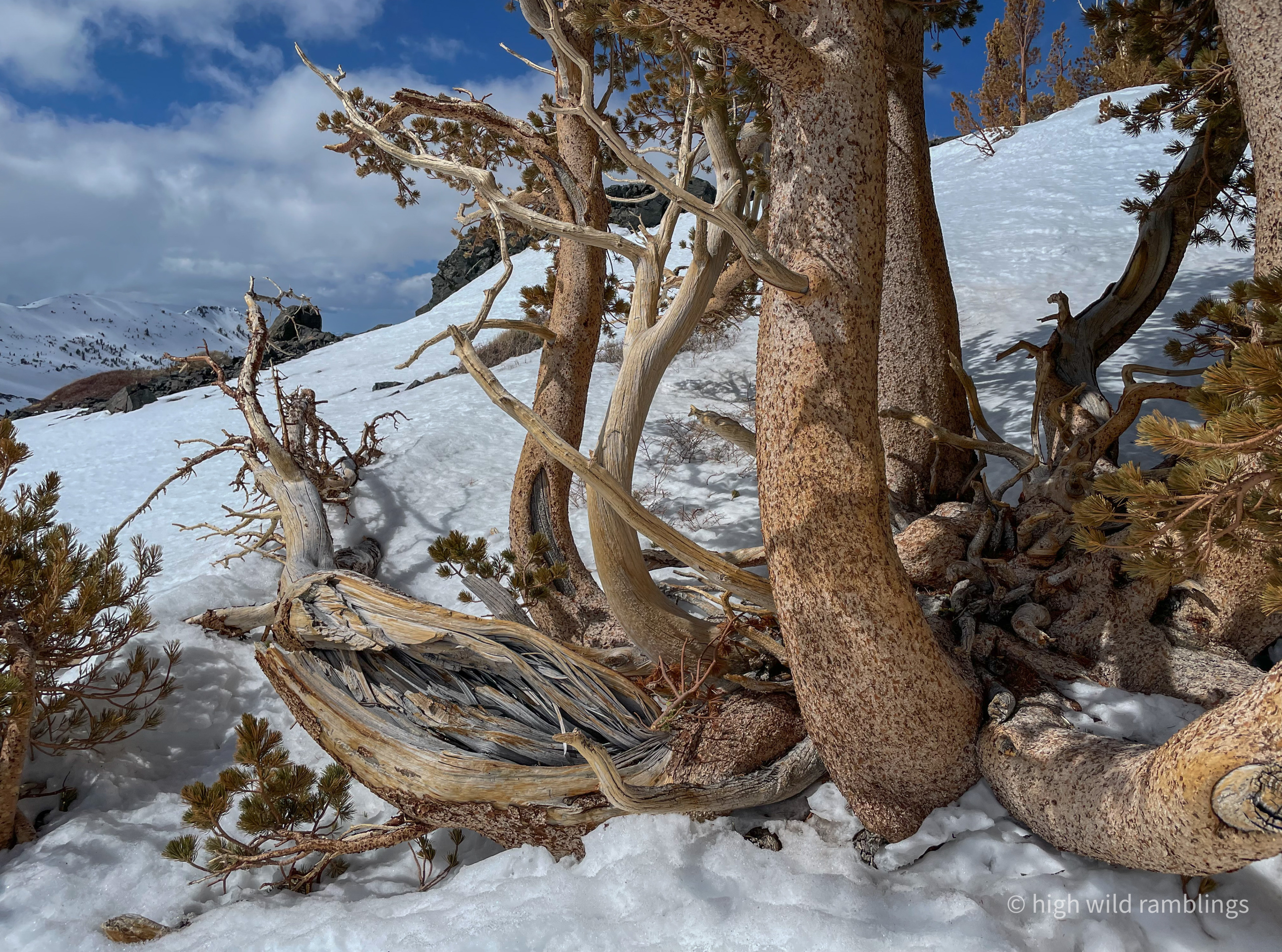Endangered Whitebark Pine (Pinus albicaulis) are a subalpine species, growing right to the limits of treeline, often in clumps like this, huddled together for shelter. Cousins to the Bristlecone Pines, the oldest trees on earth, the Whitebarks too live very slowly to great ages, patiently thriving in the extremities of their chosen home, like some other folks I know.