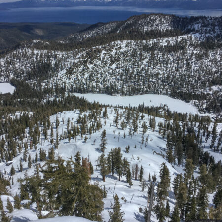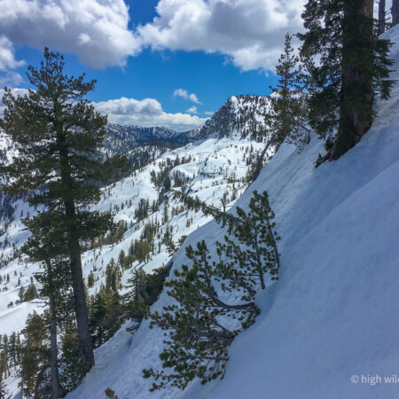 This peak is the high point in the General Creek drainage (8,721′), and I am headed up to ski the face on the looker’s left skyline. I have wanted to ski this peak for a long time, and call it dukM’e?em, after the Washoe name for the drainage, which refers to a tidal wave, suggesting a possible reference to the documented prehistoric Tahoe tsunami.