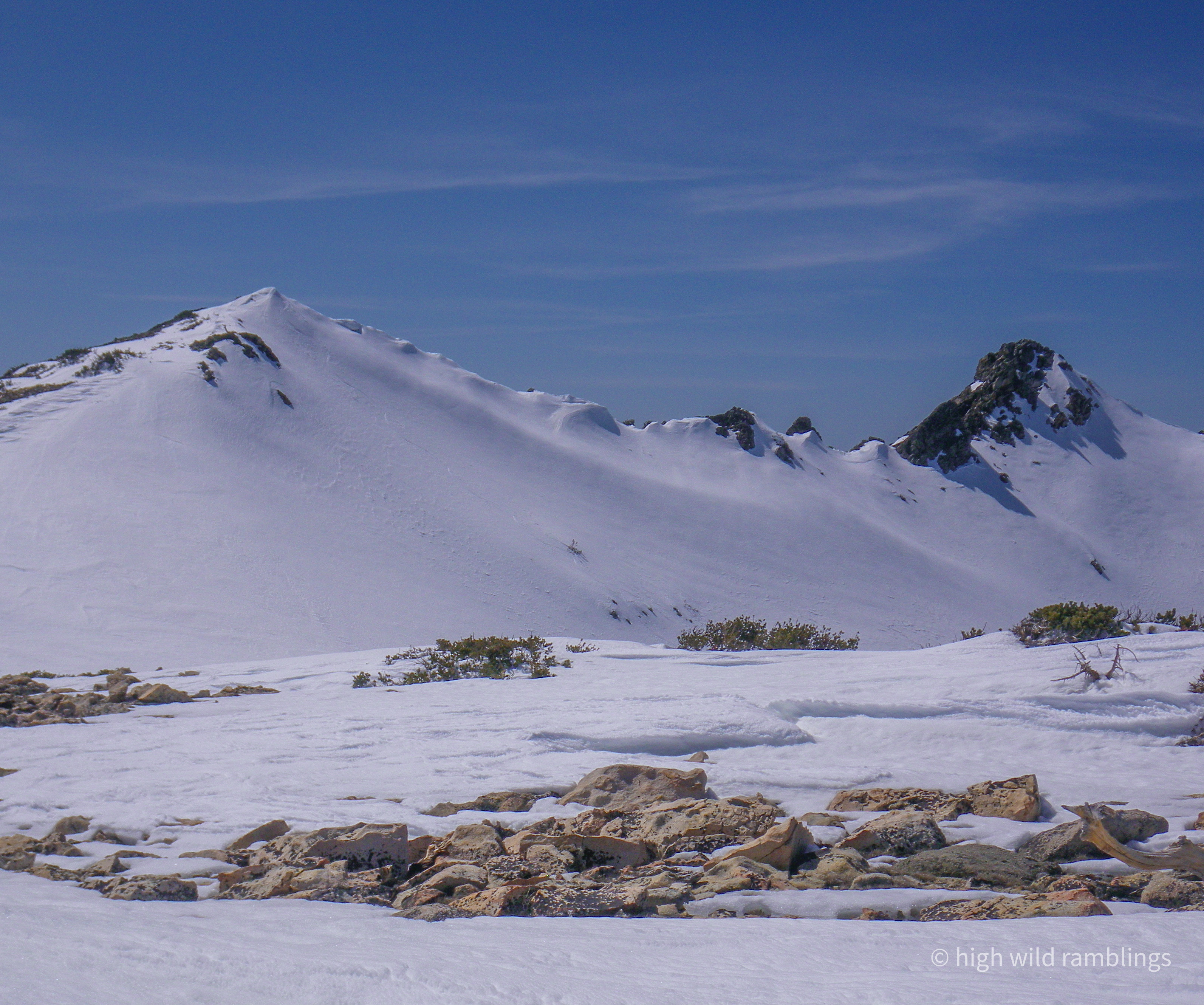From the top of my line to Doris, looking over at Ski Tip Point. Poised on the tippy top, my tips and tails hung out in space, and I chucked a flying tele plunge into a tightly linked fall-line rhythm, giggling, not another human for a hundred square miles. My tracks are just visible here