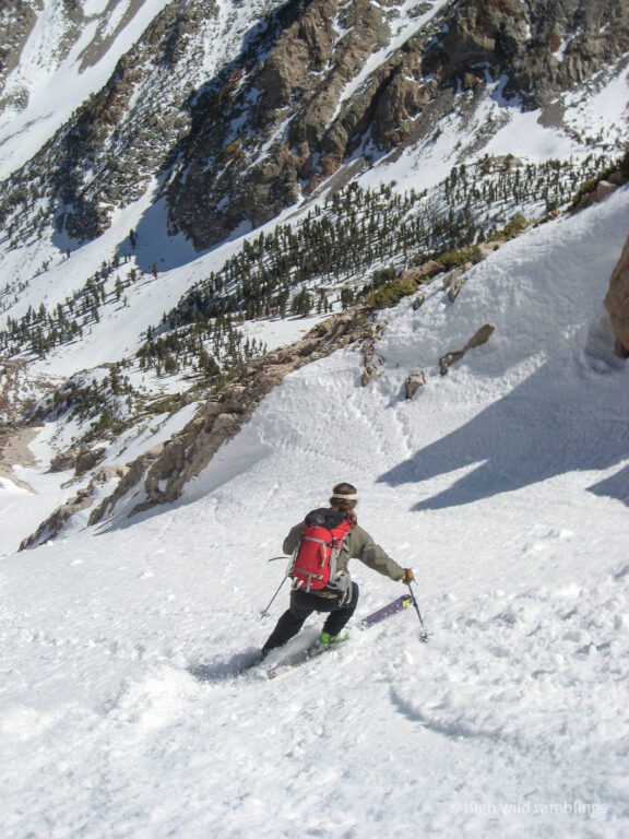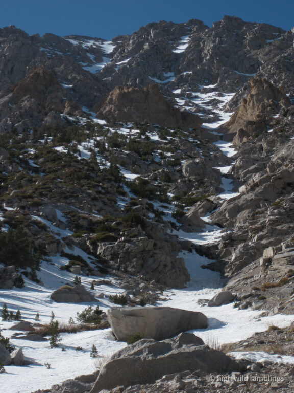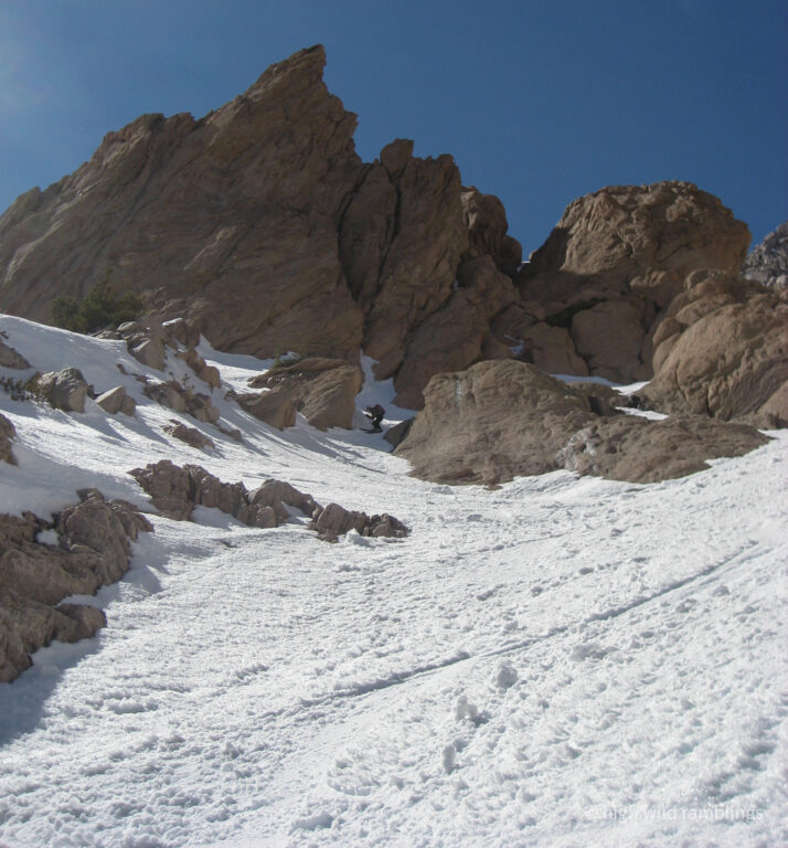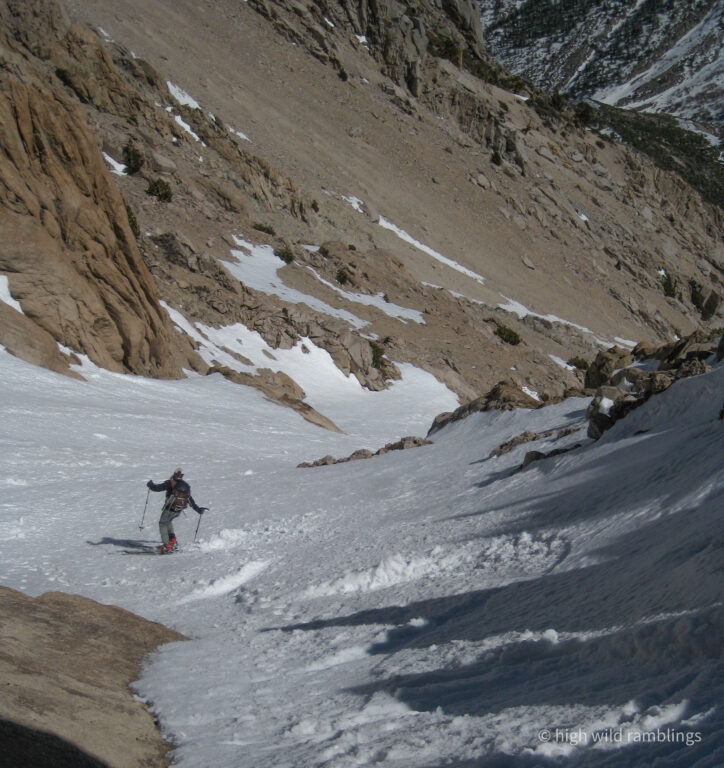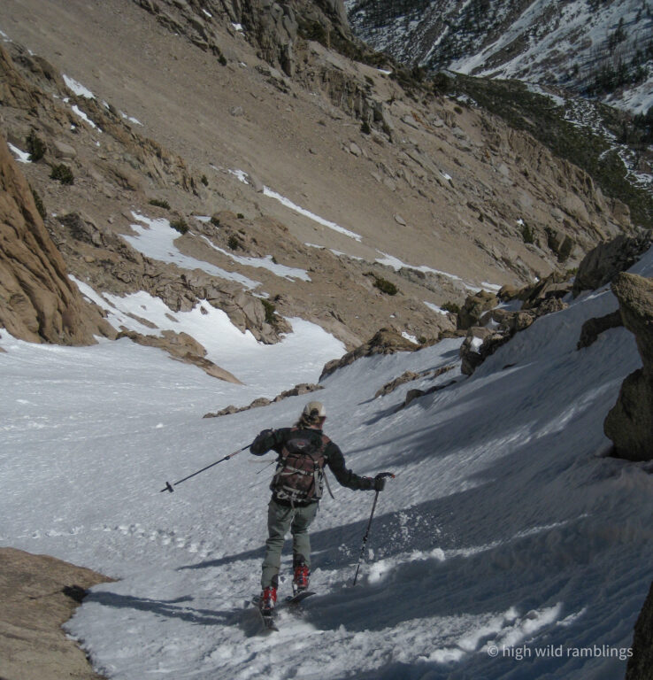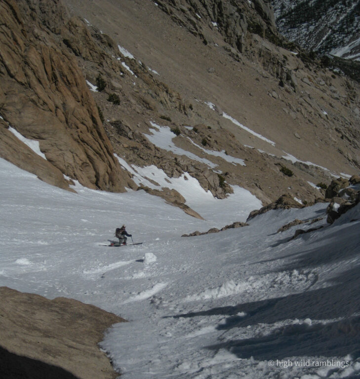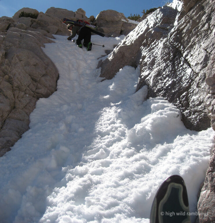…but what we couldnt tell till we got here is that the bottom was quite discontinuous. We had already invested quite a bit of time and energy getting this far though, so might as well give her a go. Plus it’s April Fools Day, so there’s that. As it turned out we spun around at the sunlit reddish outcrops visible here 2/3 of the way up, which are also visible in the prior photo, at the base of the more continuous snow. Oh well