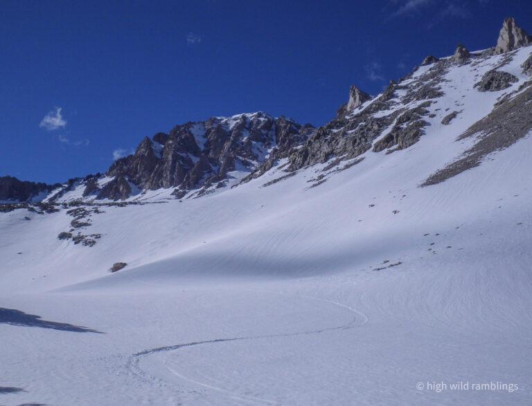 The base of the long, low angle summit ridge, extending left out of sight, from my high point at about 14,000′. It’s after 3:30 which is when the gully I want to ski starts going into shade, which is more important to me than tagging some summit, if it means I have to ski hideous crust or a less appealing, more moderate ski line. I suppose I could have started earlier, but hiking the rough and beautiful approach in the dark holds no appeal. I’m not here to force myself on the mountain, for some abstract summit claim, I’m just here to dance around in the granite hallways in this astounding cathedral, and take in what all it has to offer.