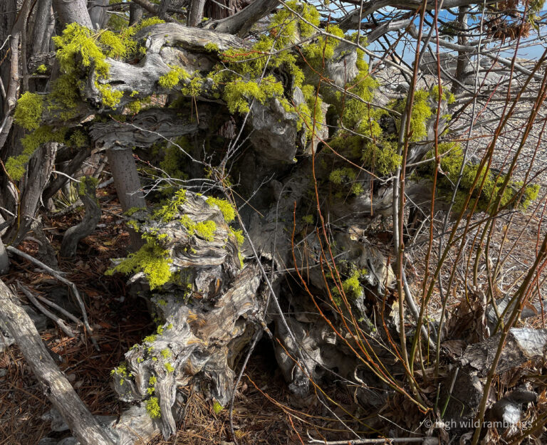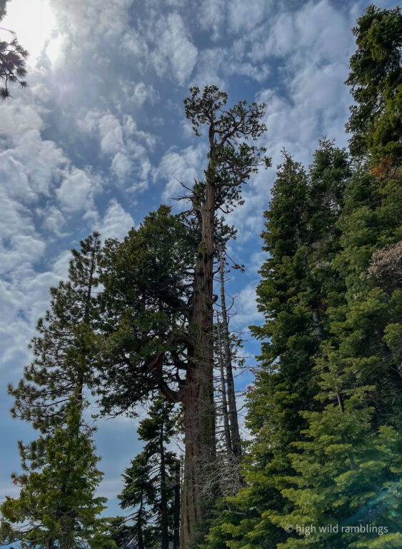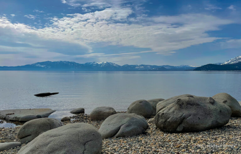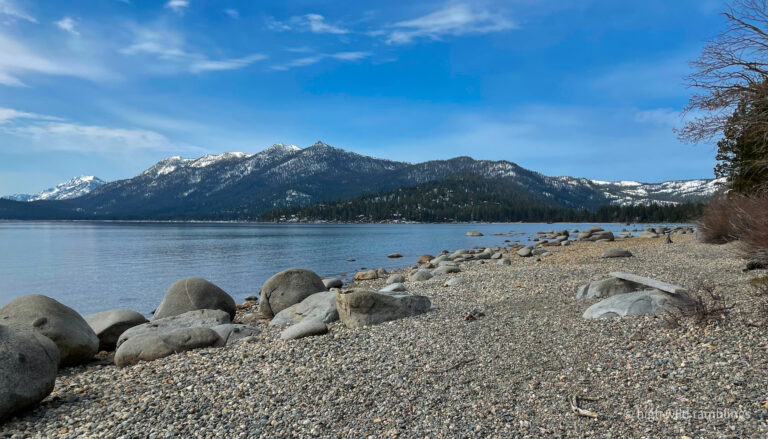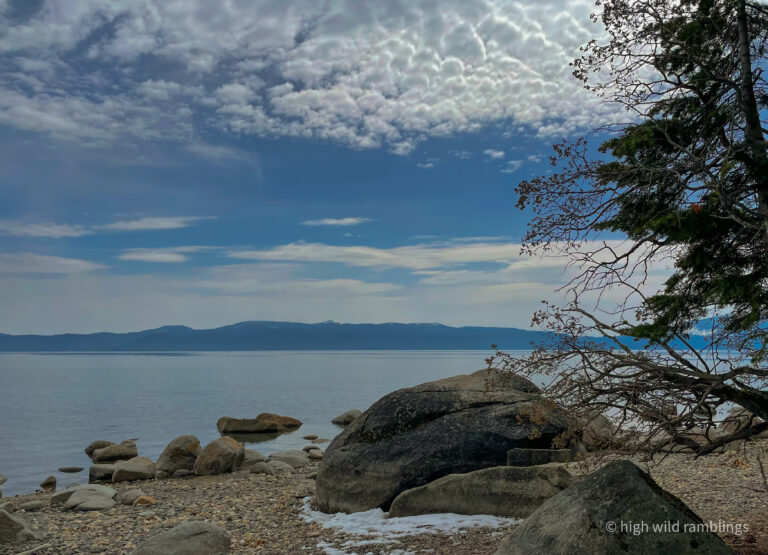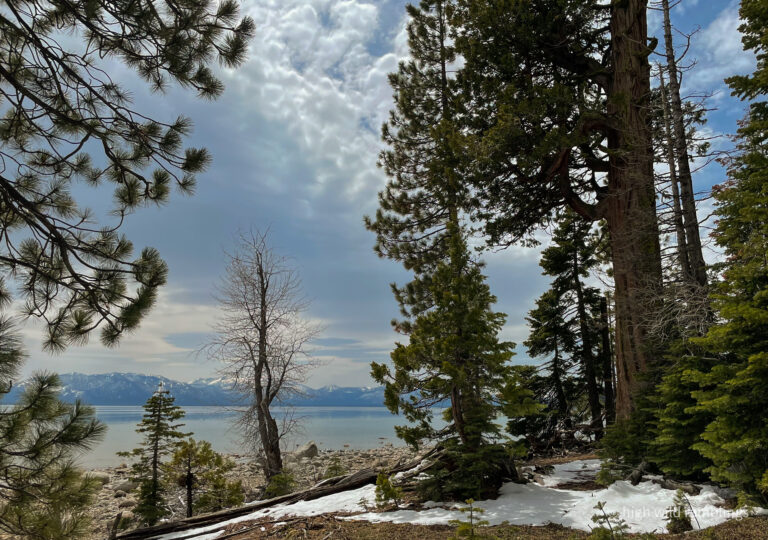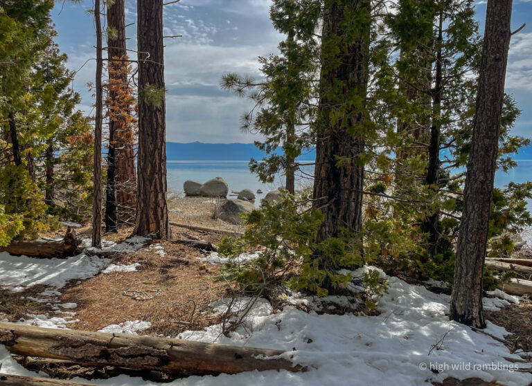 Ponderosa Pines (Pinus ponderosa) grow at lower elevations here, along the lakeshore, but are otherwise a West Slope species. Jeffrey Pines are more common here east of the Crest and at higher elevations, and the two are at times difficult to distinguish between, and in fact will hybridize with each other.