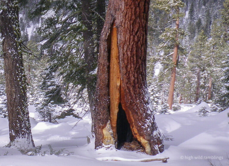 Last run at the rustic ski hut Sugar Pine (Pinus lambertiana) before it finally blew down in a big east wind event. It used to groan and creak during gusts, when I was hanging inside it out of the storm, skiing here from home. I’m not too surprised, just glad it took the kind of wind storm I never would have been up here in. Still it gives one pause. It’s not apparent in this shot, but it was leaning precipitously uphill towards the camera, defying gravity. It was also bigger than it looks, probably six feet in diameter. I could duck inside with my dog and be cozy, chilling on dry duff inside the mighty bole, even when there was a few feet of snow on the ground. This special tree offered respite when I needed it. Plus it was good company, feigning amusement at my skiing and singing antics, and I miss hanging here. see post for 11/20/2010