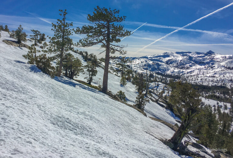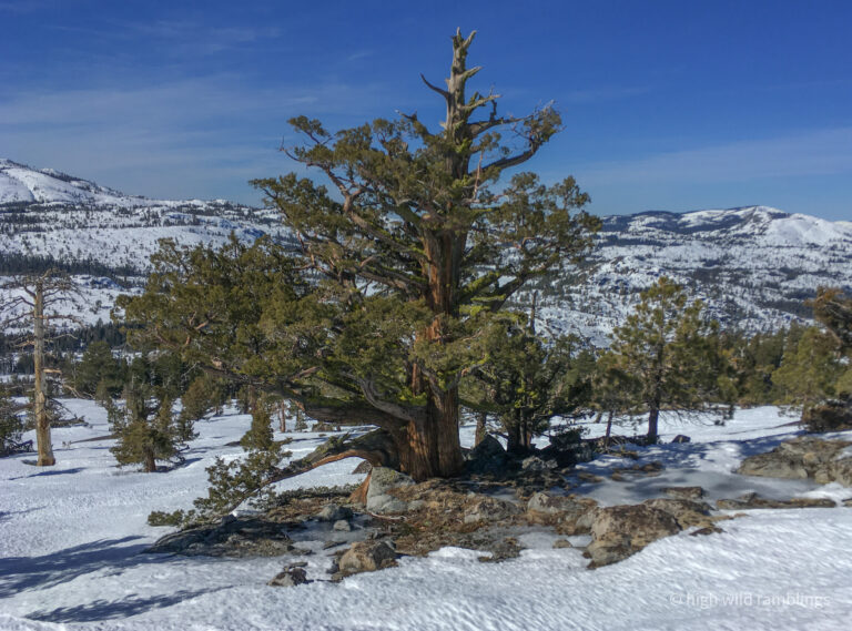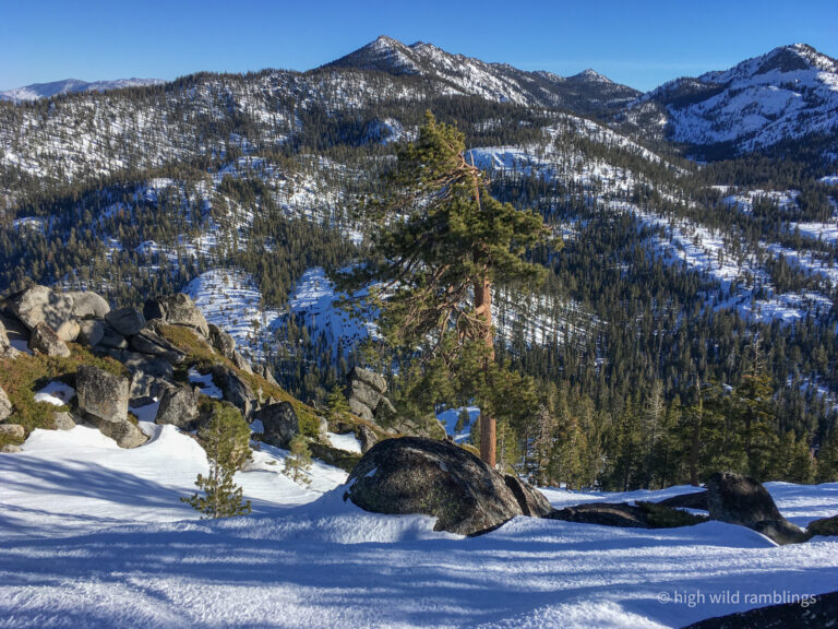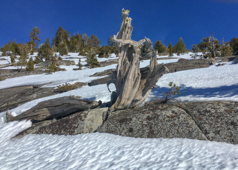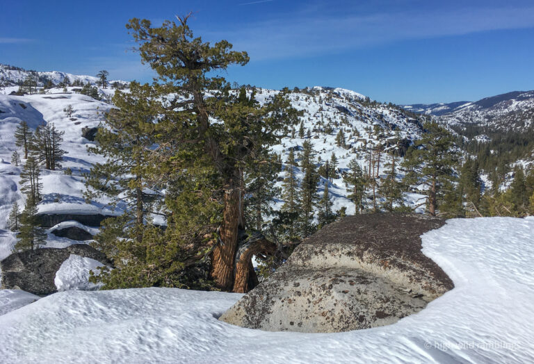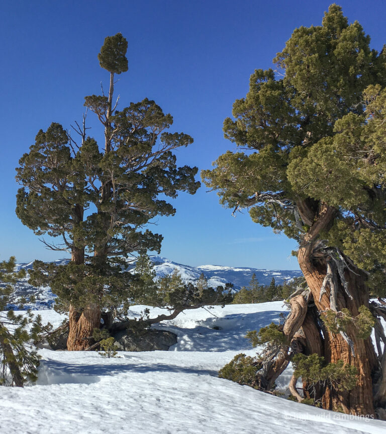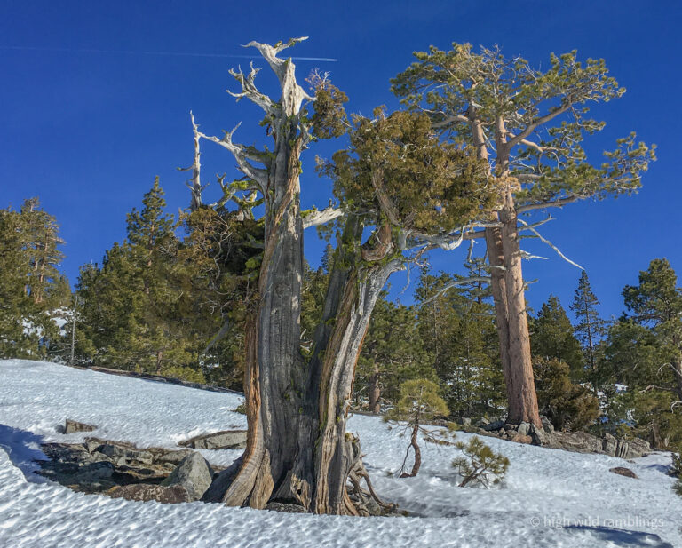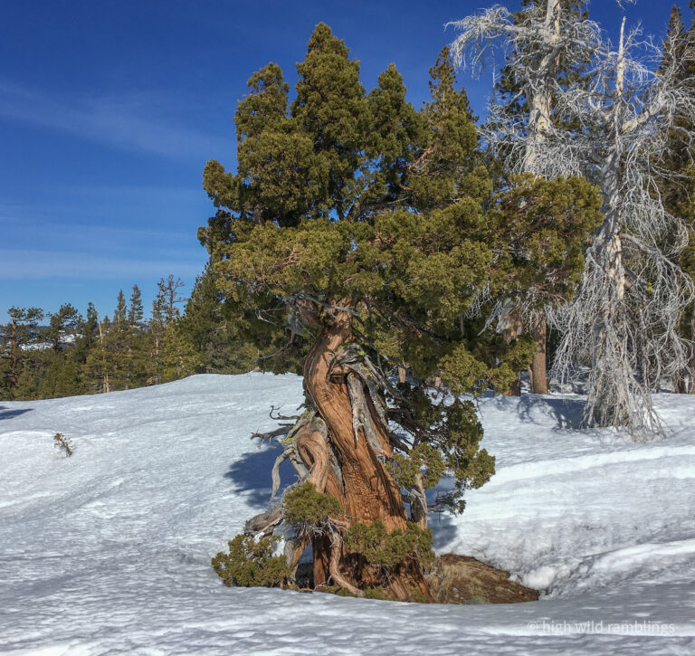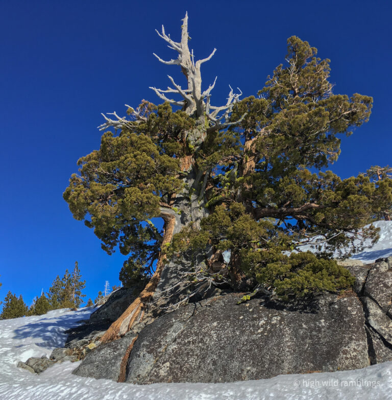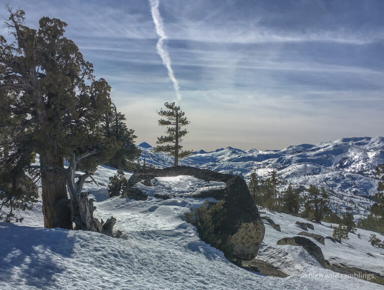 The PCT is snow covered and unused, and I cross it with no visible indicators, as if it were merely notional, a line drawn on a map. As if. In the summer its like a throughway, thousands of backpackers, from Mexico to Canada, or even just around the Tahoe Rim, also a popular bucket list trail, that runs concurrently here. I usually stop here at Hortense the Juniper for the view, and the official entry/exit into wide open Rockbound Valley, wisps of vapor carrying my greeting to the four winds, thankful to walk in such beauty.