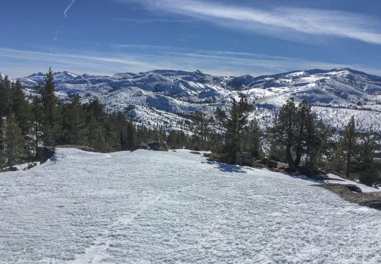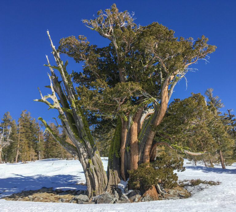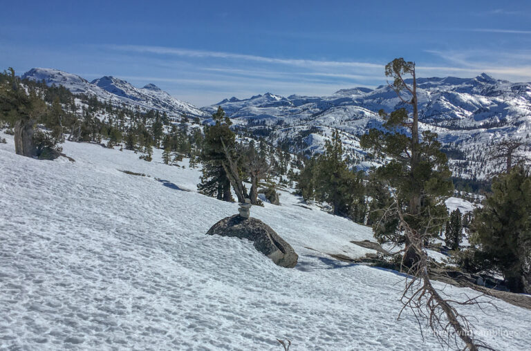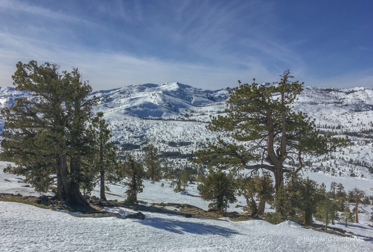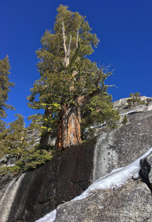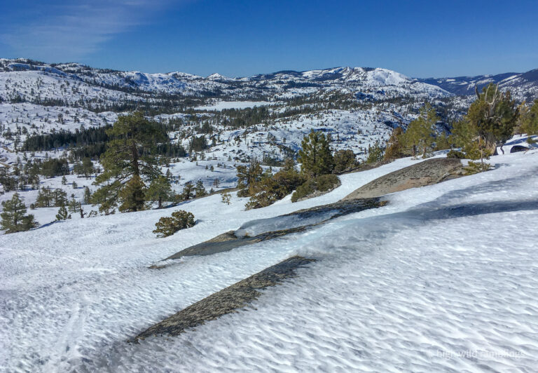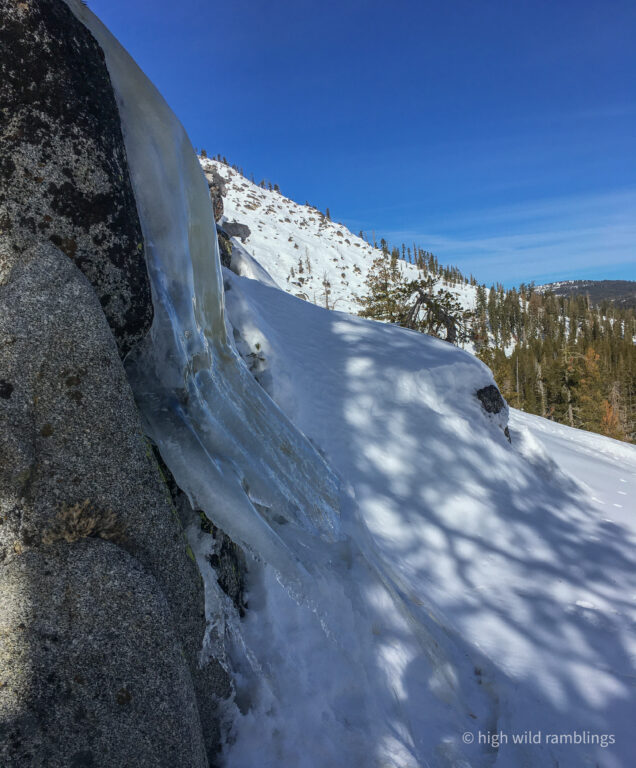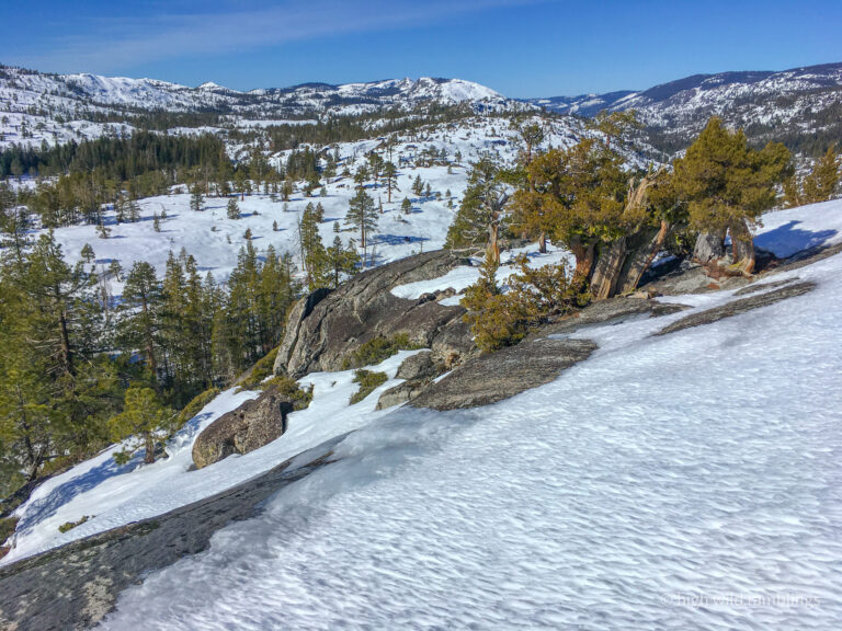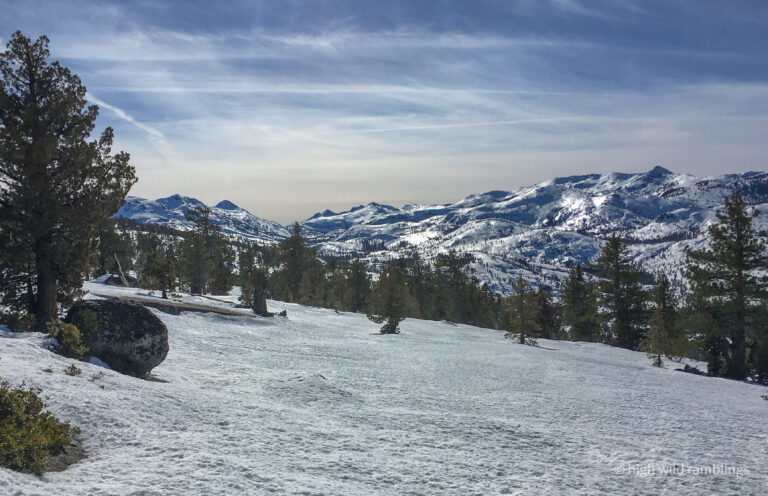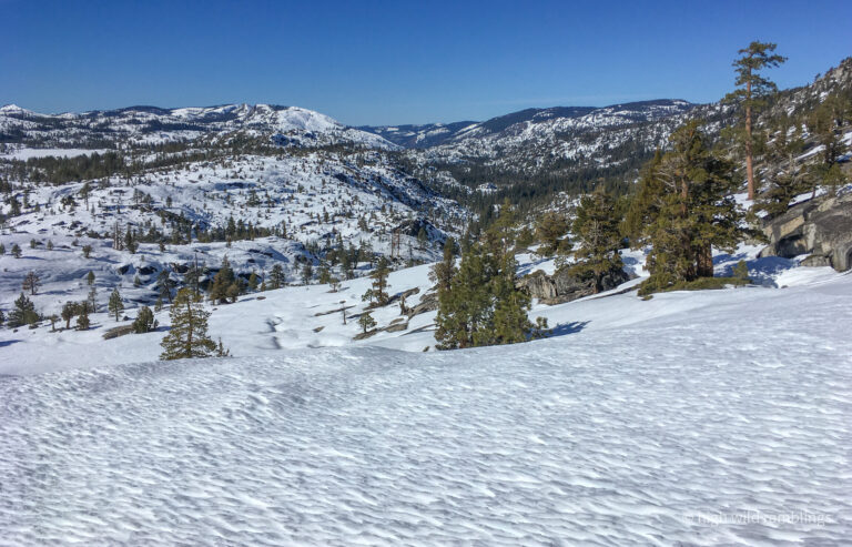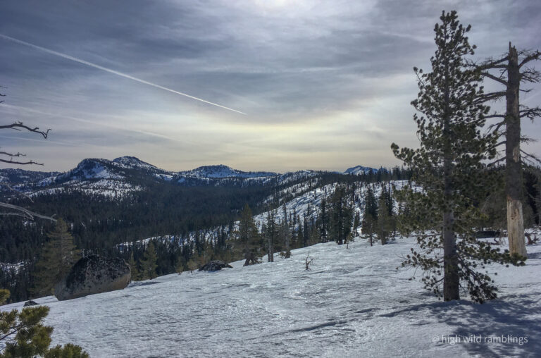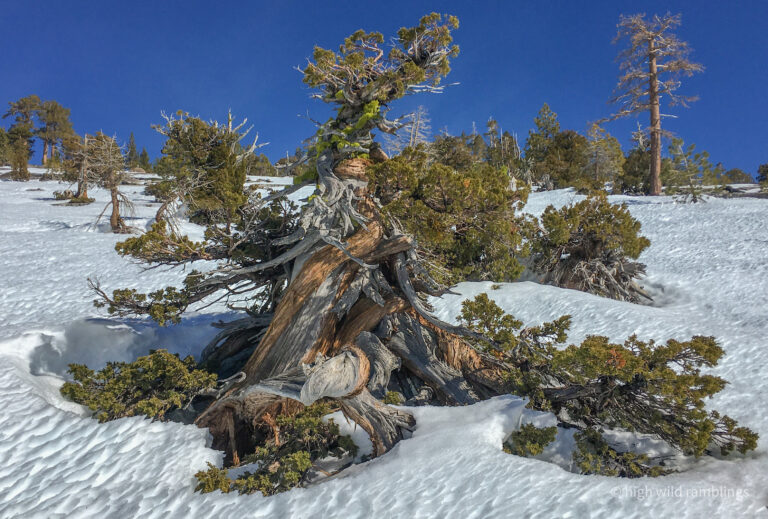The PCT is snow covered and unused, and I cross it with no visible indicators, as if it were merely notional, a line drawn on a map. As if. In the summer its like a throughway, thousands of backpackers, from Mexico to Canada, or even just around the Tahoe Rim, also a popular bucket list trail, that runs concurrently here. I usually stop here at Hortense the Juniper for the view, and the official entry/exit into wide open Rockbound Valley, wisps of vapor carrying my greeting to the four winds, thankful to walk in such beauty.