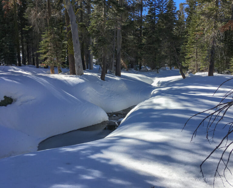 I grin, sailing amongst the pointy tips of shed-sized boulders just breaking the surface, following my nose down to the creek. I’m glad to see and hear open water moving through windows in the snow pack, flowing again already. The creek runs dry up here by early summer most years, but I sense that it generally flows for most of the winter, buried or not. The five inches of rain we got in October was probably enough to get it going again, and then the record December snowfall sealed it in.