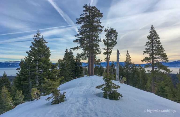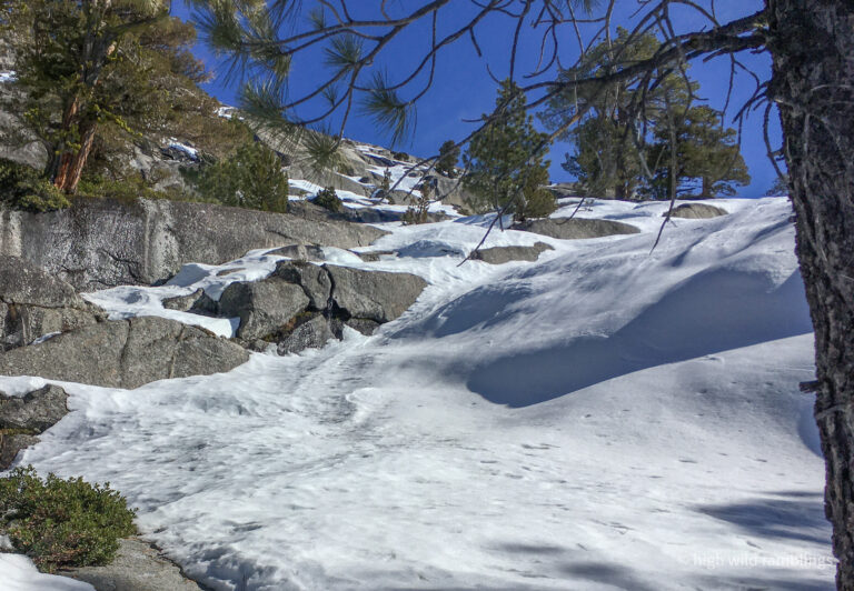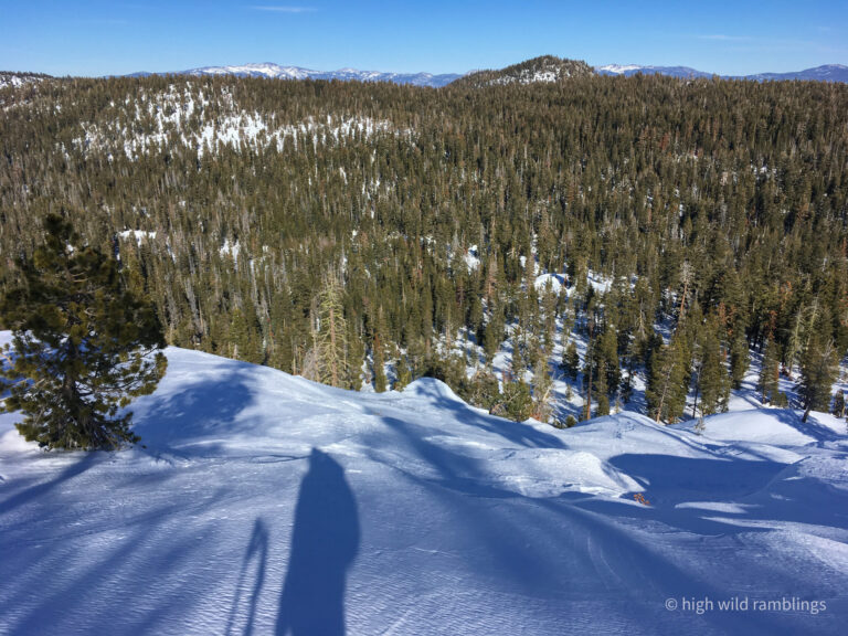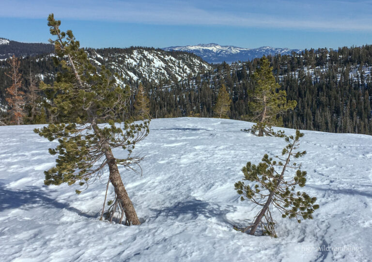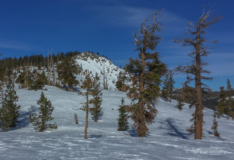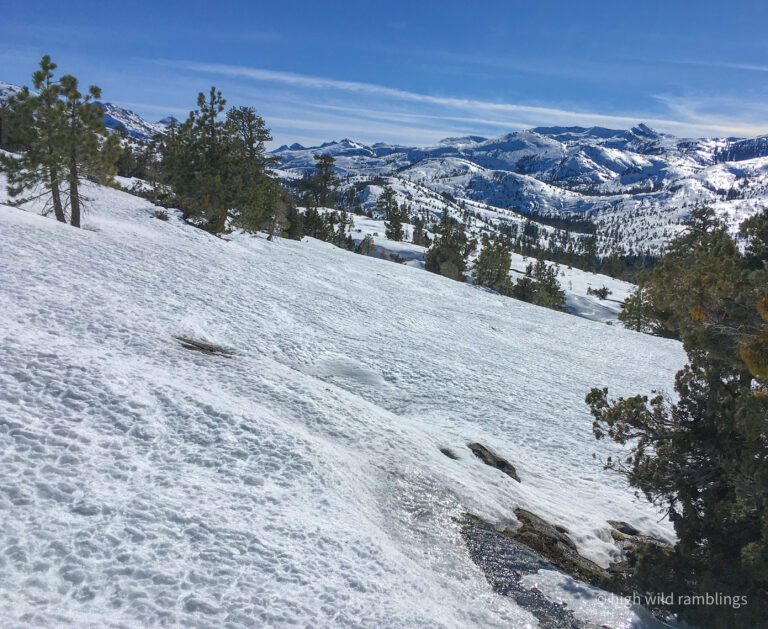 Looking over my shoulder, the icy Crystal range is shining in the afternoon sun, beautiful but forbidding. My eye alights on familiar peaks, prompting memories. This is my first look at Rockbound Valley since last fall’s wildfire threatened. At one point, it was reported that a spot fire had blown a mile and a half up and over the Crystal Range to the shores of Aloha Reservoir. From there it was easy enough to envision the prevailing south westerlies blowing the fire to the grove on Mosquito Pass and then on down Rockbound Valley, to eventually get blown over the crest proper at the low spot where I crossed it today, and then on down canyon to Lake Tahoe.