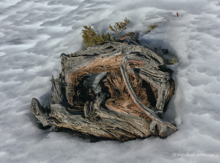 Here’s a juniper as big around as it is tall, sculpted by the elements over the centuries, time worn like bedrock. These hoary wizened lichen encrusted old trees seem almost inert, as if part mineral, with no give in their boughs. They have born most of an eon of wild extremes of drought and flood, blizzard and heat wave here. This makes it particularly poignant to see how many mature five hundred plus year old junipers are dying back just now, in just the last few years, abandoning the majority of their foliage to turn brown and die, self-pruning to maintain key branches that are more protected and well fed by roots, moving to adopt the classic ancient juniper form where standing dead wood serves as shelter for the few meager twisted strands of living bark that remain, growing in it’s own lee, constructing it’s own shelter, like a tortoise.