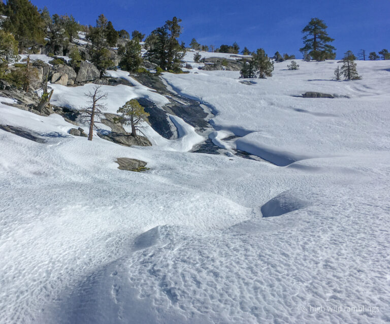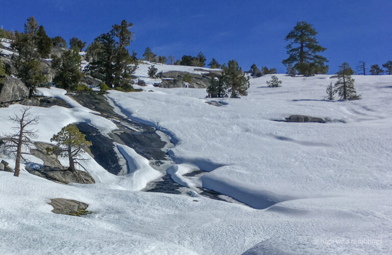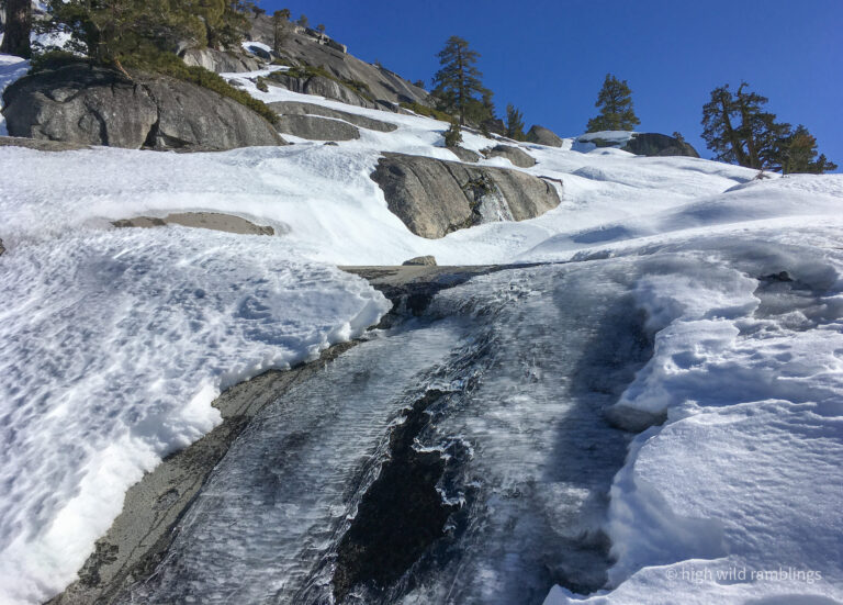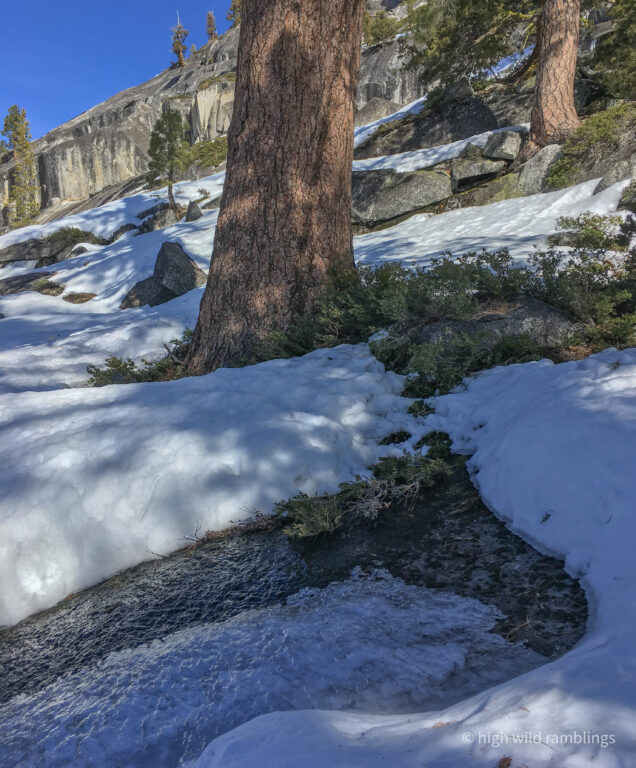 The big sprawling symmetrical old Jeffery pine that stands silhouetted at the base of the passage to the upper slabs, hoves into view above, as I round up onto the rim of the Skate Park bowl. Here I pause to take in the details. The creek is flowing in the bowl and has excavated out a course for itself through the few feet of snow that lies consolidated here, what’s left of our record setting December snows, worn right back to the bare granite in the channel. Whenever I come down here in the summer I eye the smooth rolling concavities, picturing the forces that the shapes represent, the latent potentiality for motion. Coming here on skis is the manifestation of that, and I relish the subtext to my little ski run, picturing my knowing smile here come summer. Its like a little gift to my future self, a flirtation with time’s penchant for circling back.