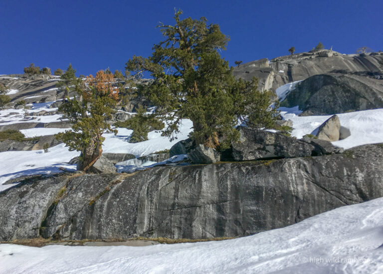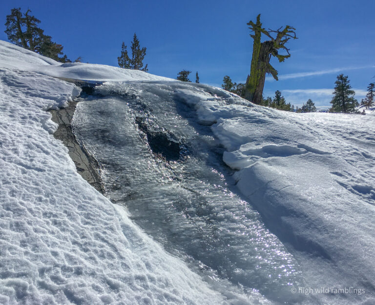 It’s a natural crossing spot, where routes up and down the west and east slopes cross the route that follows the crest. Probably has been all along. I found a chert arrowhead fragment just above the trail here. I use this route because it is the cleanest way through in the summer, mostly on granite, top to bottom. And even in the winter, it’s the way to go. The snow collects where the vegetation is thinnest, and vice versa. Even in brushy spots, game trails push through. The critters know the ways, since time immemorial. This place molds us in it’s likeness.