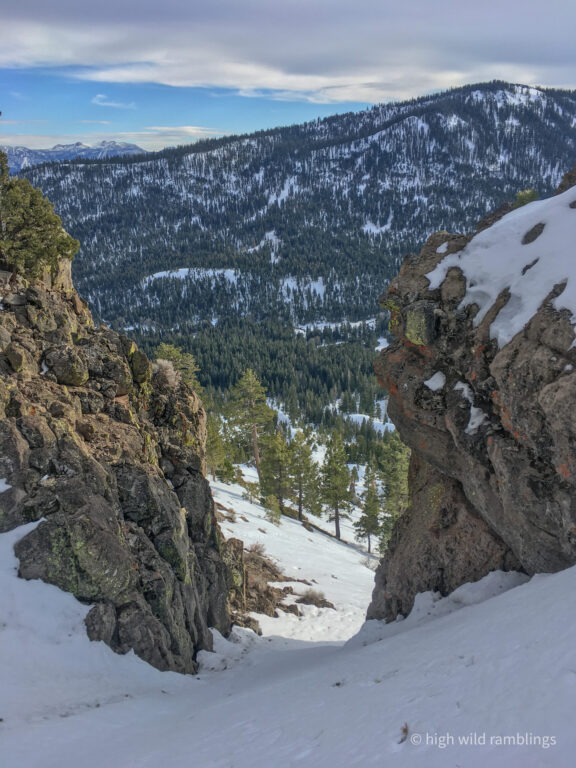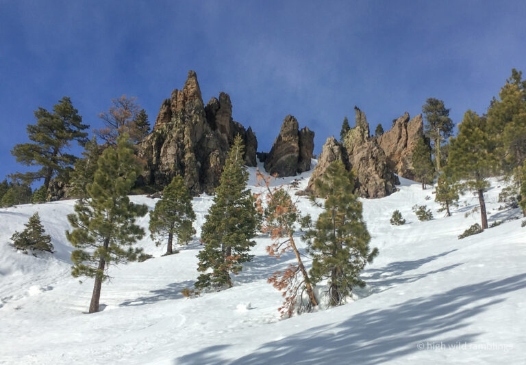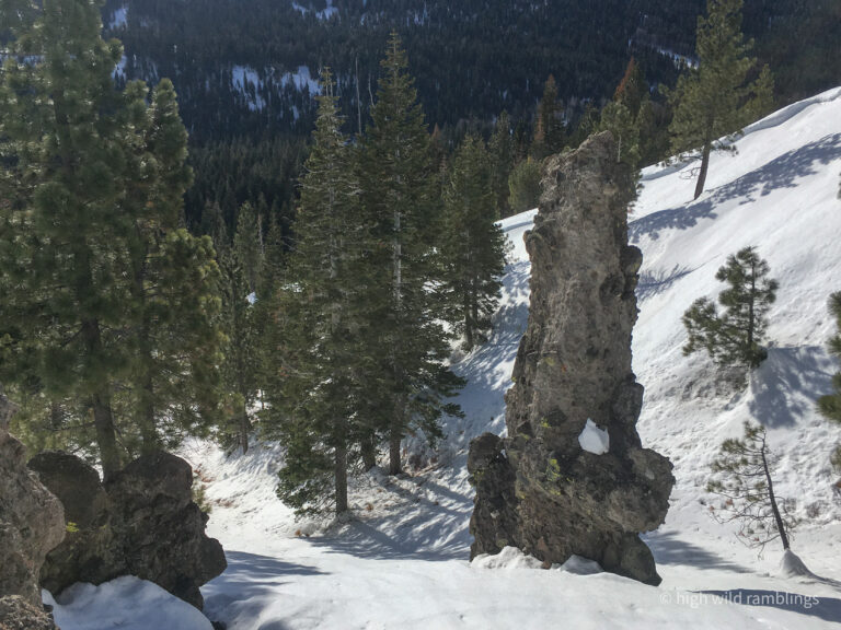 Columnar basalt swooping up out of the snow. I first found this formation moonlight fresh pow, roomer skiing on my old wooden three pins. It made a big impression. Not sure just how the usually strait parallel sided columns were deformed, probably slow distortion while they were buried, cooling and contracting, splitting along geometric crystalline lines with flair. (I have better photos of it somewhere which I’ll post and link when they turn up)