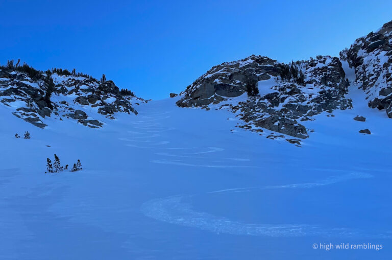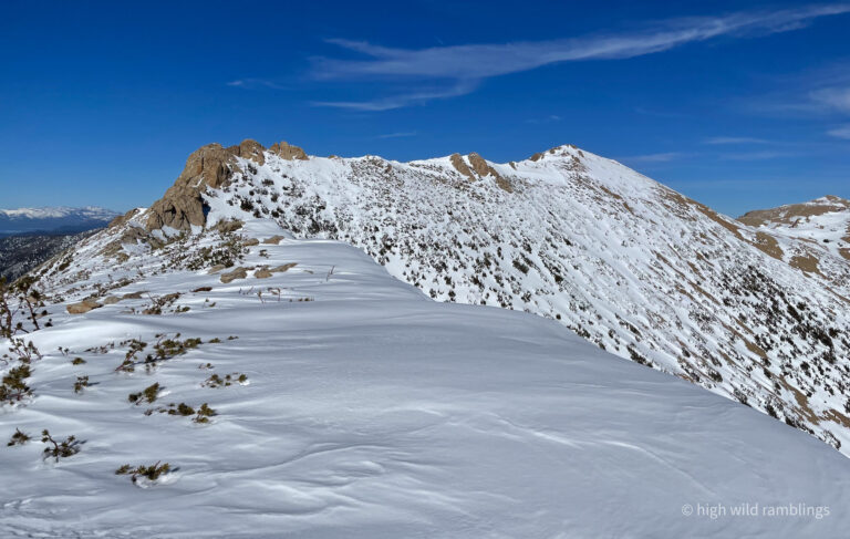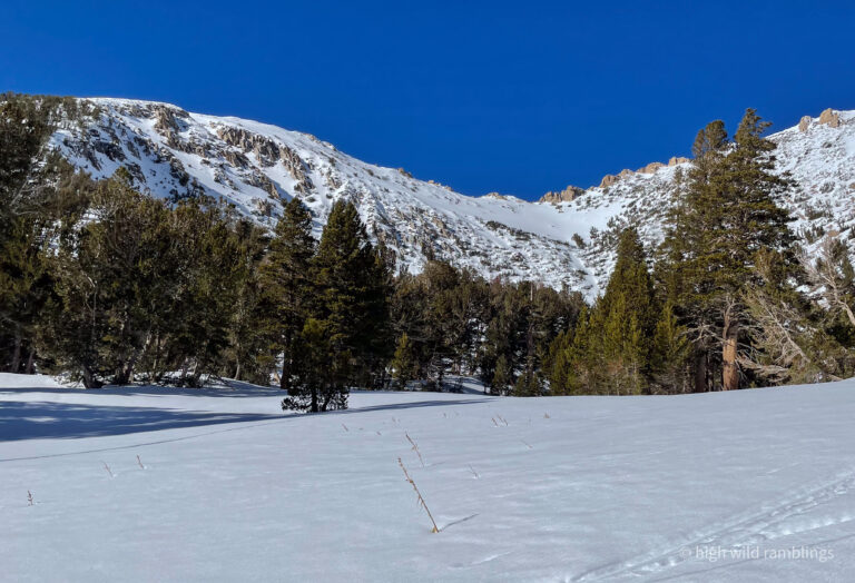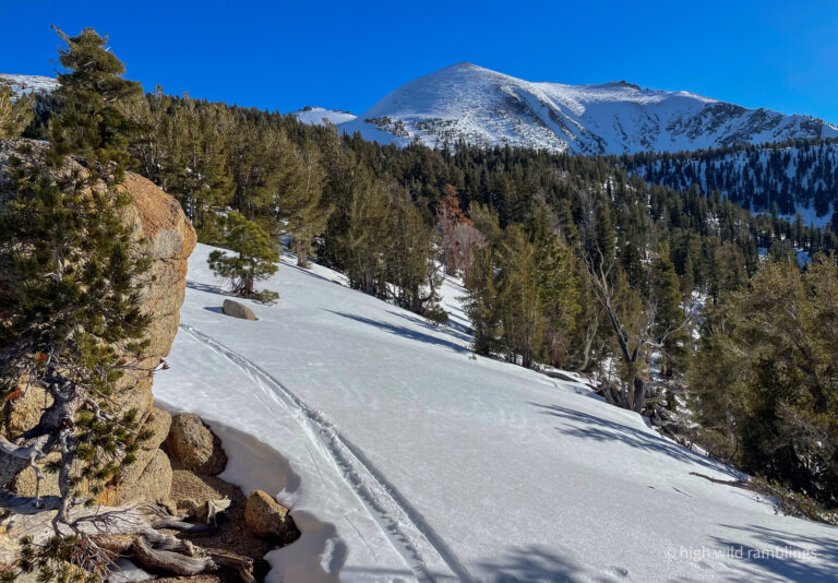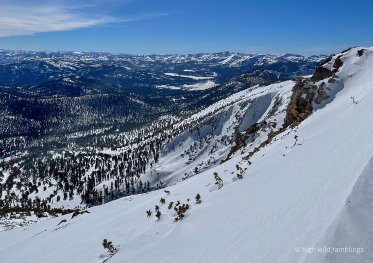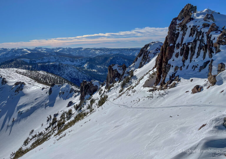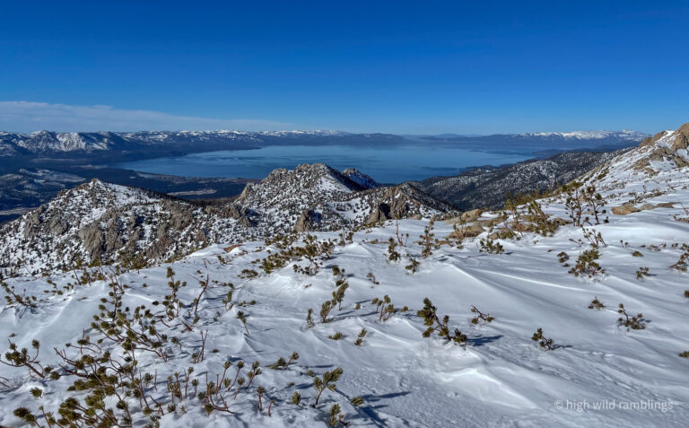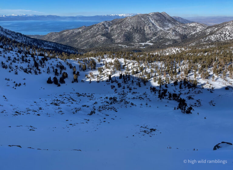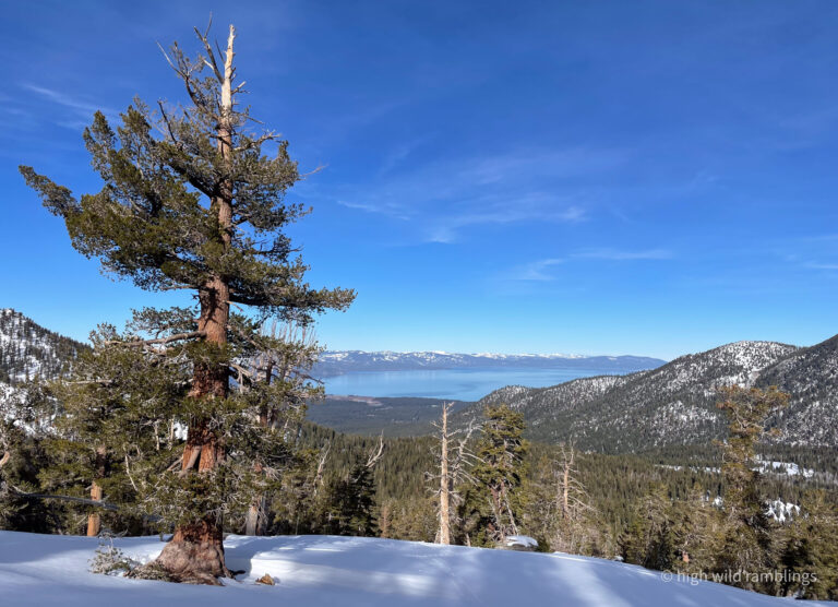 Old school trail marker, a can lid nailed to a tree with a quartz crystal stuck in the top, along this route headed over a pass into the adjoining Carson Valley, dating to pioneer times, maybe much older. The scarring above the can lid may be a healed blaze, and there are old nails in the trunk, near new nails that are likely glow in the dark markers for ultra runners. I sail past without a sign, not even touching the ground.