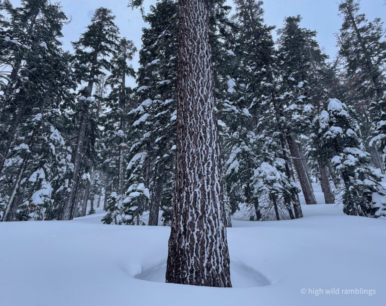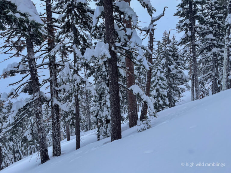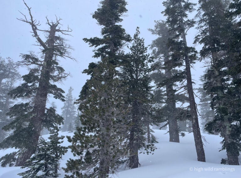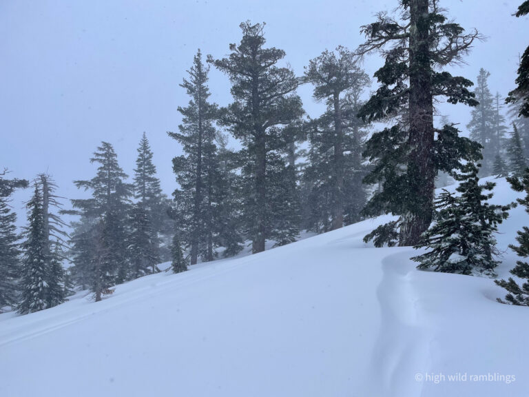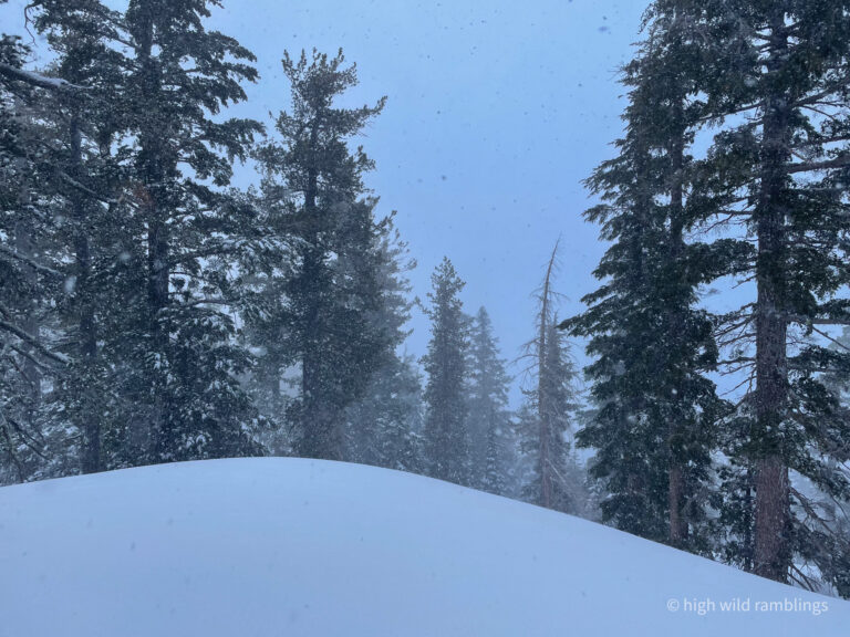 Remote sensor reported winds blowing 84mph gusting to 122 mph now on the Crest at top of Palisades, which was closed. But this sweet run starts well below the ridgetop, nestled deep in the old growth.