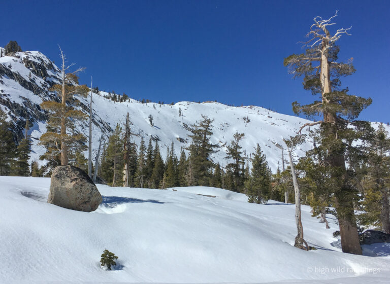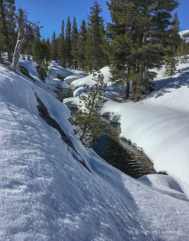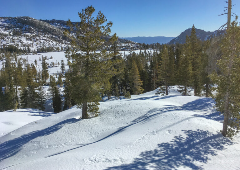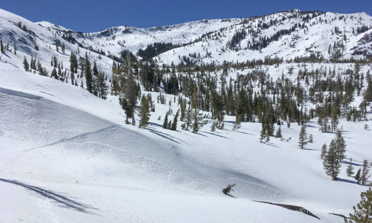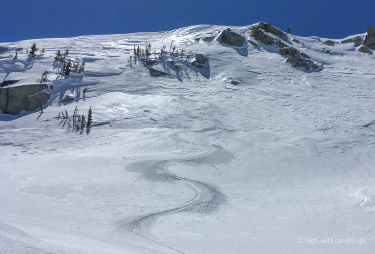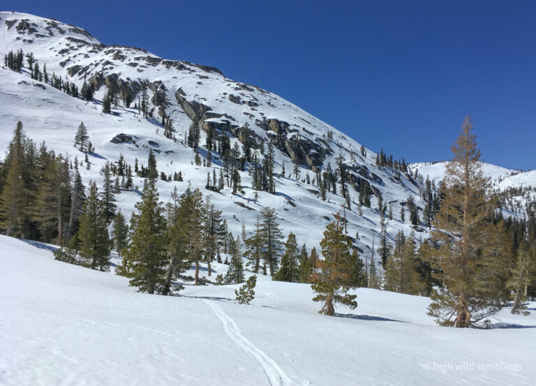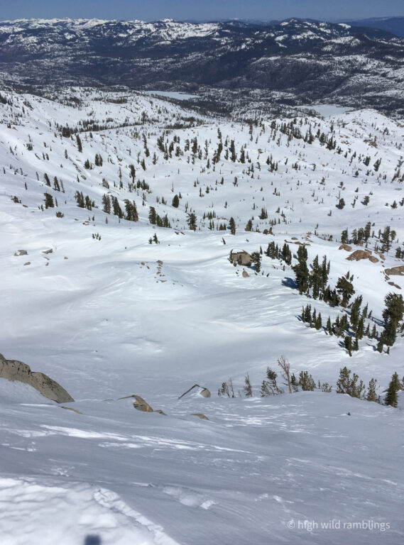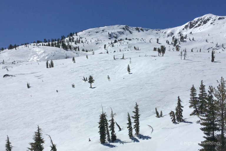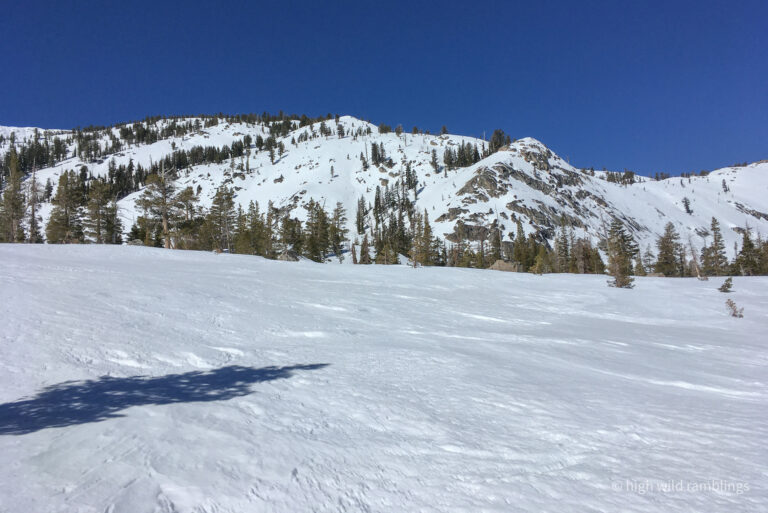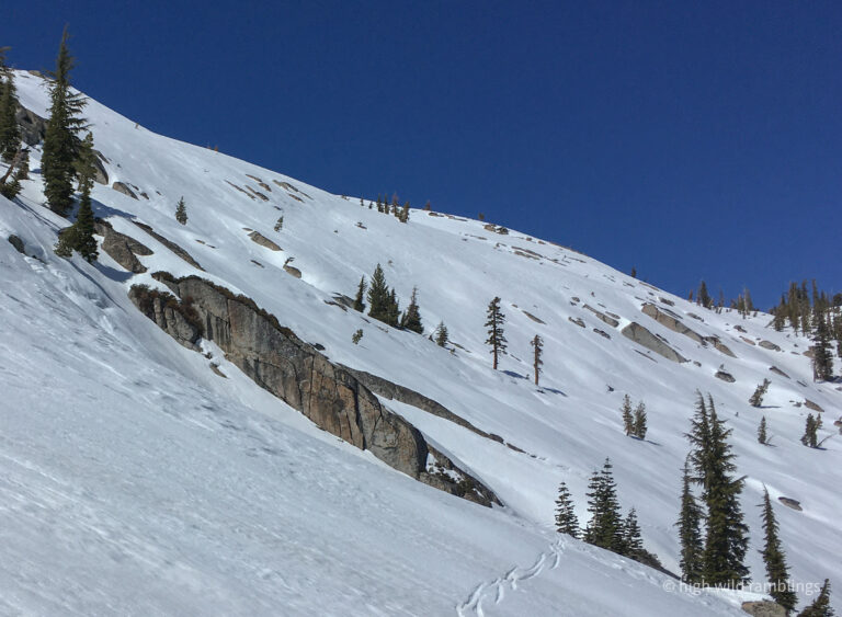 The water-streaked slabs above the summer trail, which I aspire to ski, are visible at center. I hope to ski down to them from the crest out of sight above.