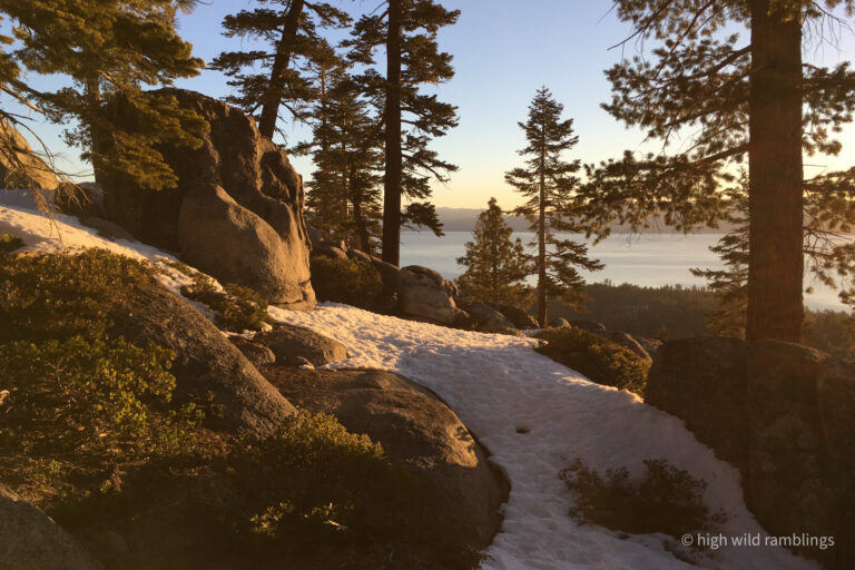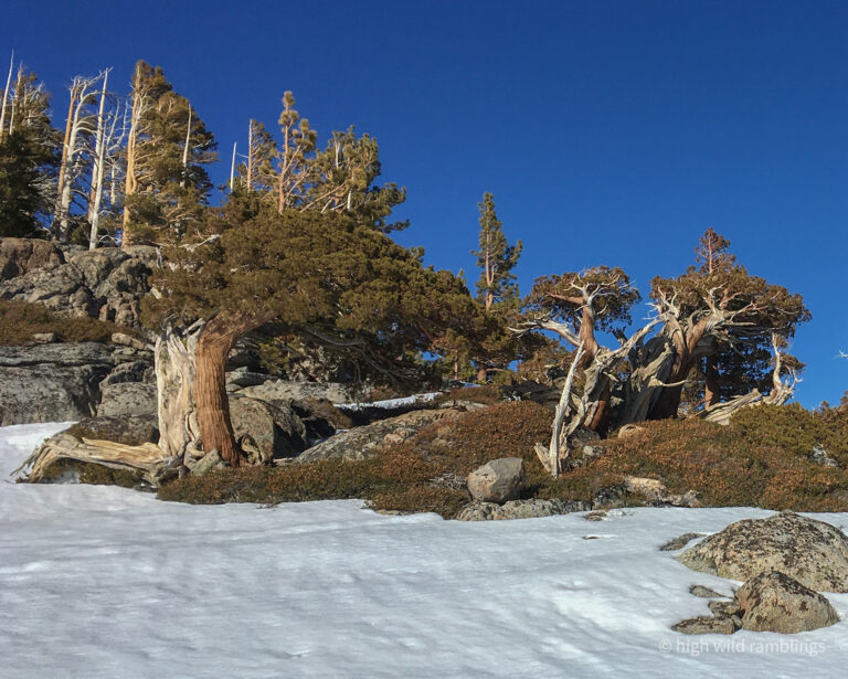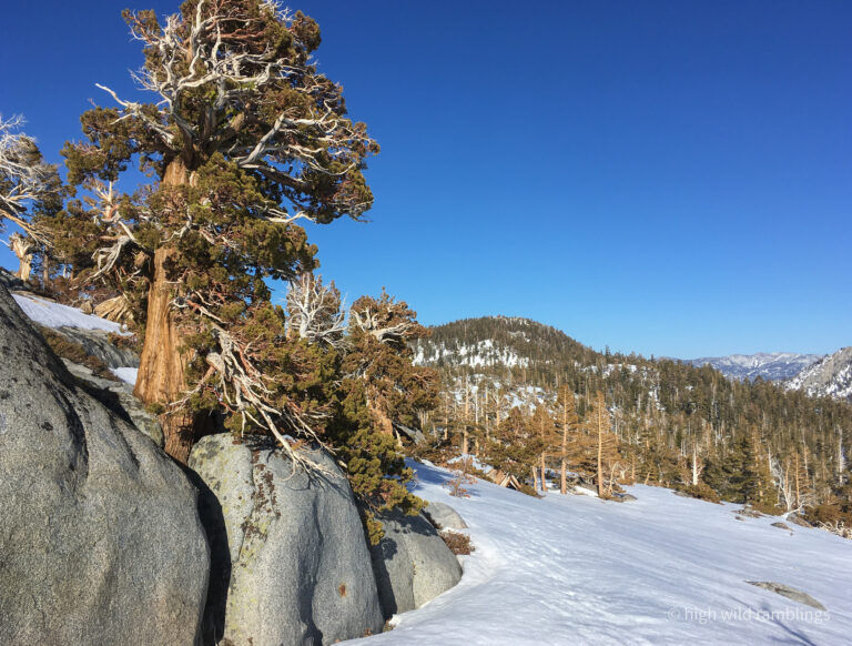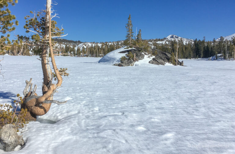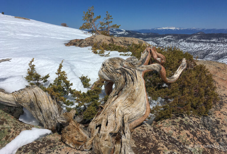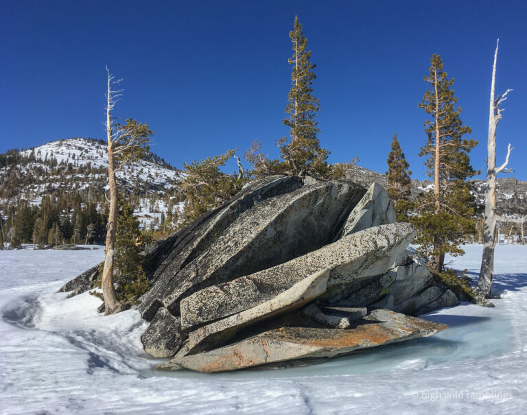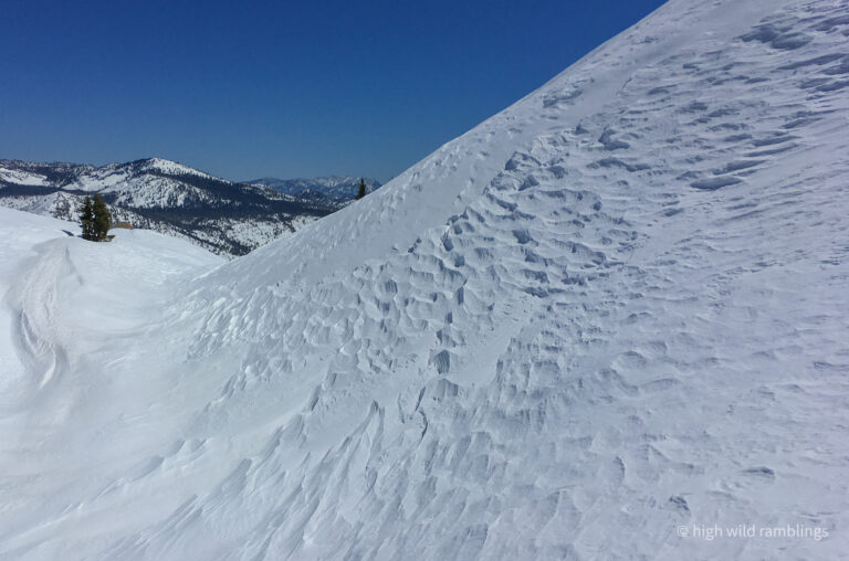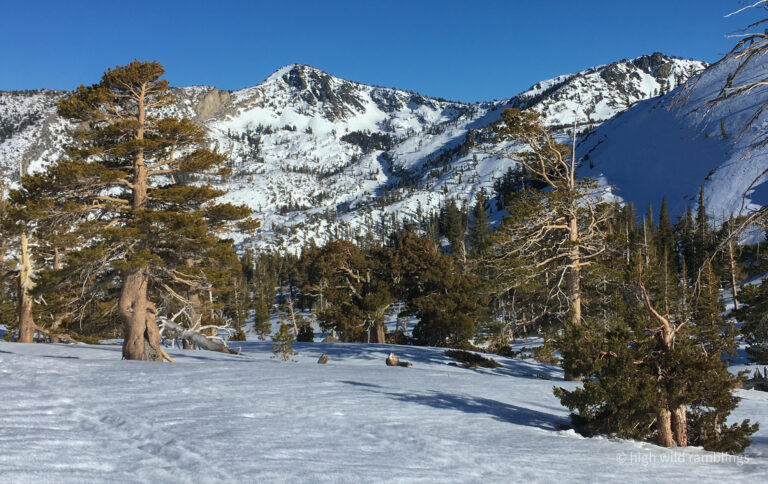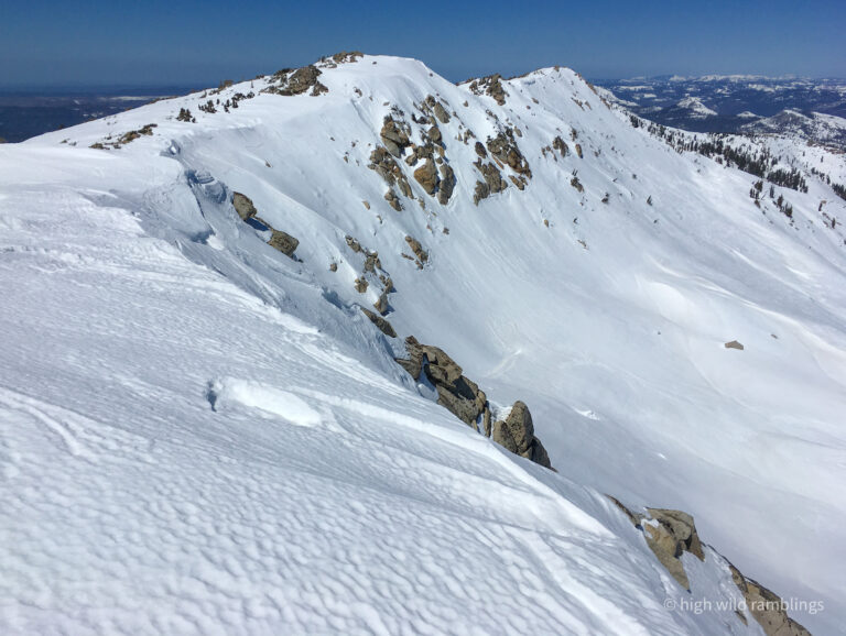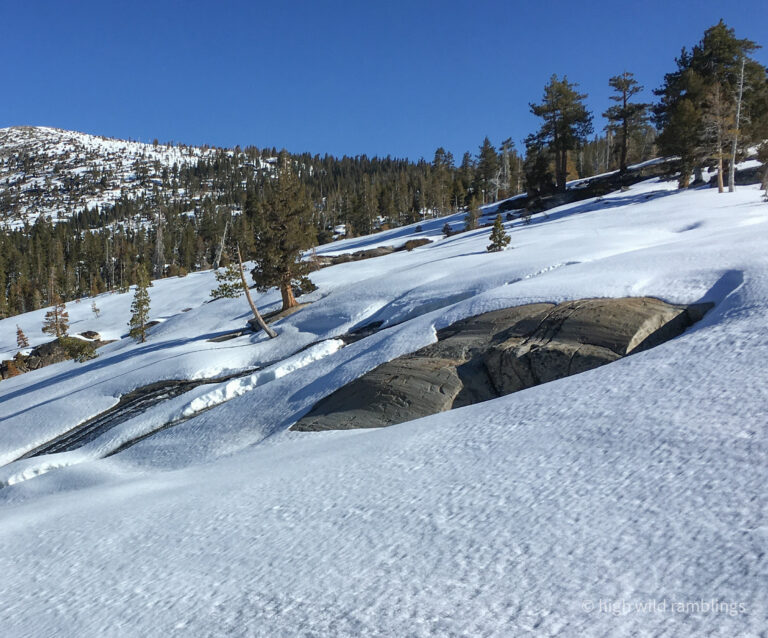 The water-streaked slabs above the summer trail, which I aspire to ski, are visible at center. I hope to ski down to them from the crest out of sight above.