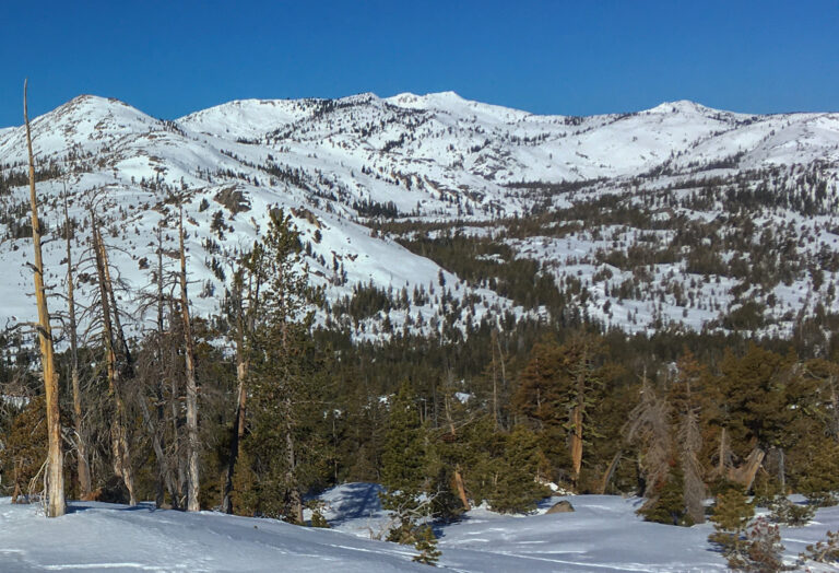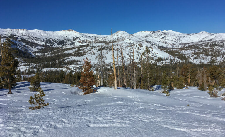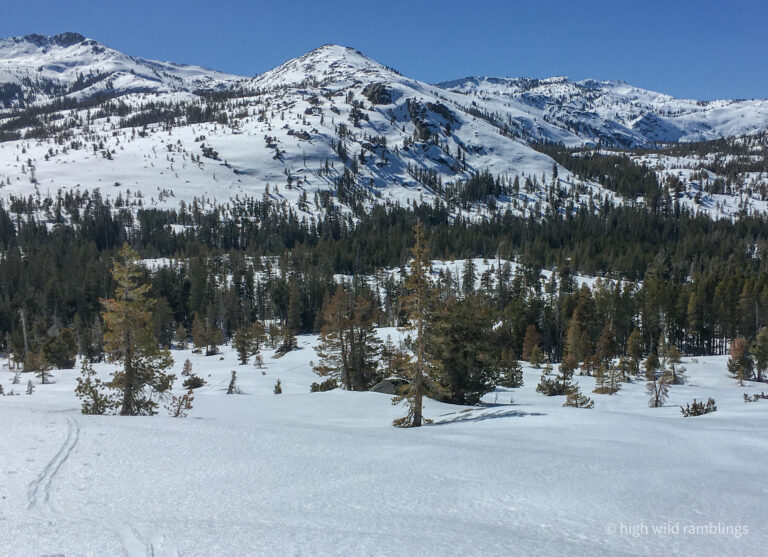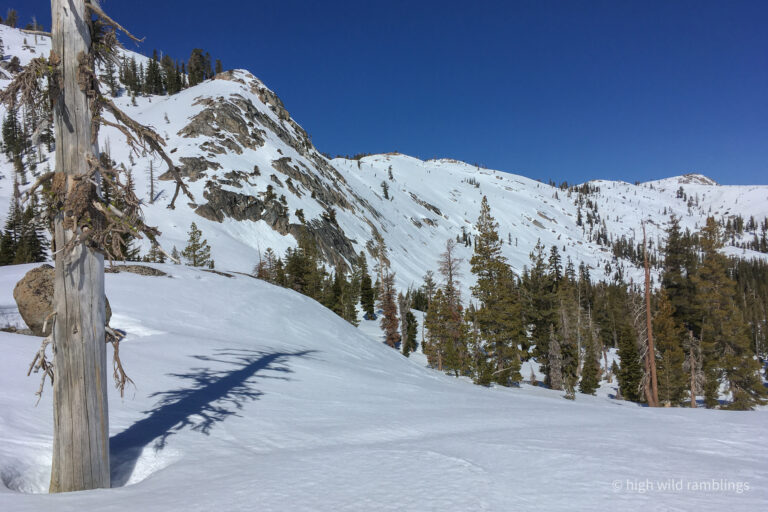 My intended route crosses the Rubicon River in the forest below, then follows trees right around base of open knoll and wraps up into 4Q lakes basin at center, and along toe of slope above, and around base of buttress, out of sight up to base of open treed slope that leads up and right to the crest just left of center, making four big sweeping turns to gain the ridgetop. Then descend hidden bowl coming down and right to big sunny open slope and down and back left to rejoin my route coming up, milking the gradient for skin-free shuffling.