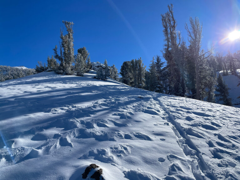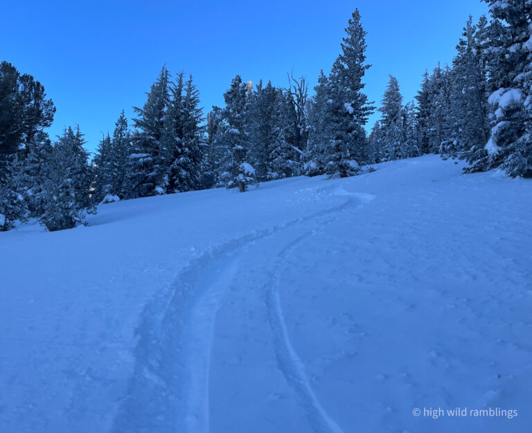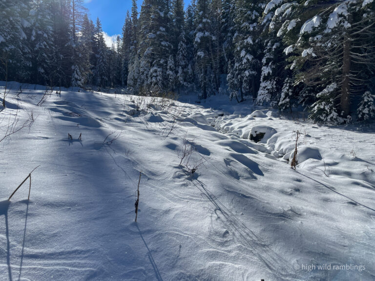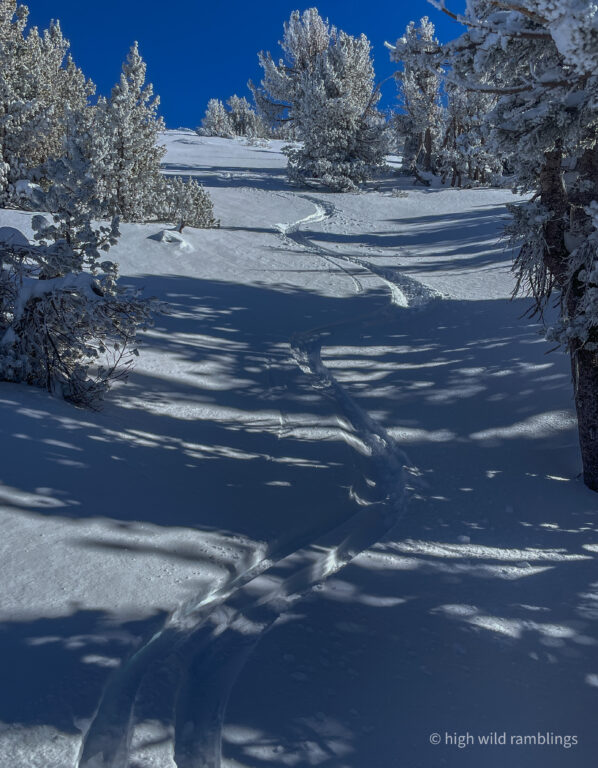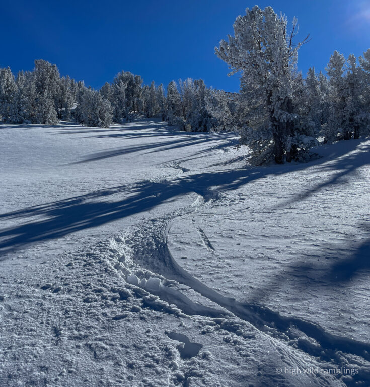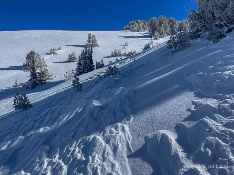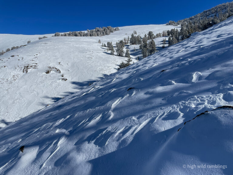 can see how the loose powder on the surface has been stripped down to a subtle, uniform layer beneath it, which is also powder, the slope facing into the sun not so much