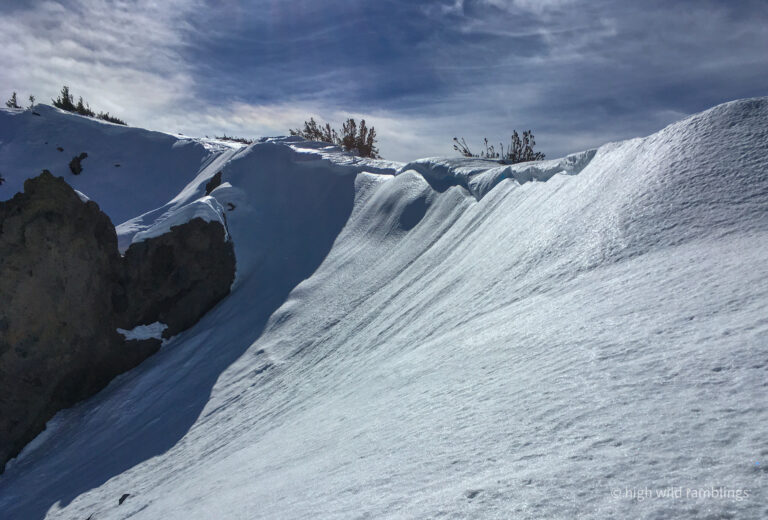 A nascent glide crack forming behind the little cornice already, where it had been sagging in the sun. I could’ve used a bit more of that warming today.